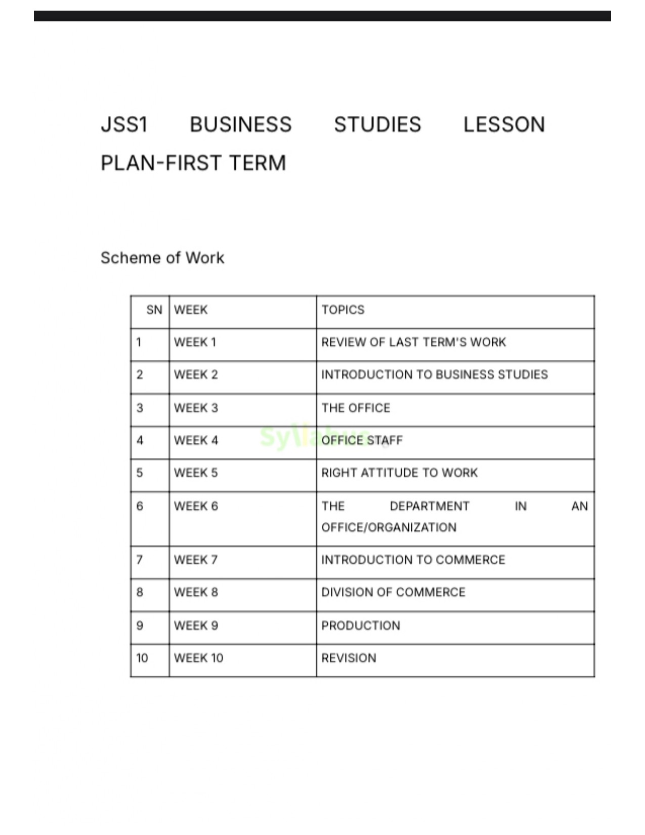 JSS1 BUSINESS STUDIES LESSON PLAN DESCRIPTIONS Our JSS1 Business Studies lesson plans enhance your teaching by providing you with meticulously structured content for the entire academic session. Each week features clear learning objectives, detailed content breakdowns, and engaging activities that align perfectly with the current curriculum. They contain practical activities that connect classroom learning to real-world business scenarios, helping students develop both theoretical knowledge and critical thinking skills. These lesson plans incorporate discussions, role-plays, and group activities that make complex business concepts accessible to young learners. Whether you're a novice or experienced teacher, these lesson plans ensure your students grasp essential business concepts while you save valuable preparation time. WHY GET OUR LESSON PLAN? Creating engaging Business Studies lessons that balance theory with practical applications can be time-consuming. Our lesson plans solve this challenge by providing ready-to-use materials that follow the current curriculum standards. Covering the entire academic session, each week is carefully structured with clear objectives, teaching strategies, class activities, and assessment tools. These lesson plans include visual aids, suggestions, discussion prompts, and interactive exercises that bring business concepts to life in your classroom. With these resources, you'll spend less time planning and more time delivering impactful lessons. Our lesson plans are downloadable and accessible on any device, allowing you to prepare anywhere, anytime.