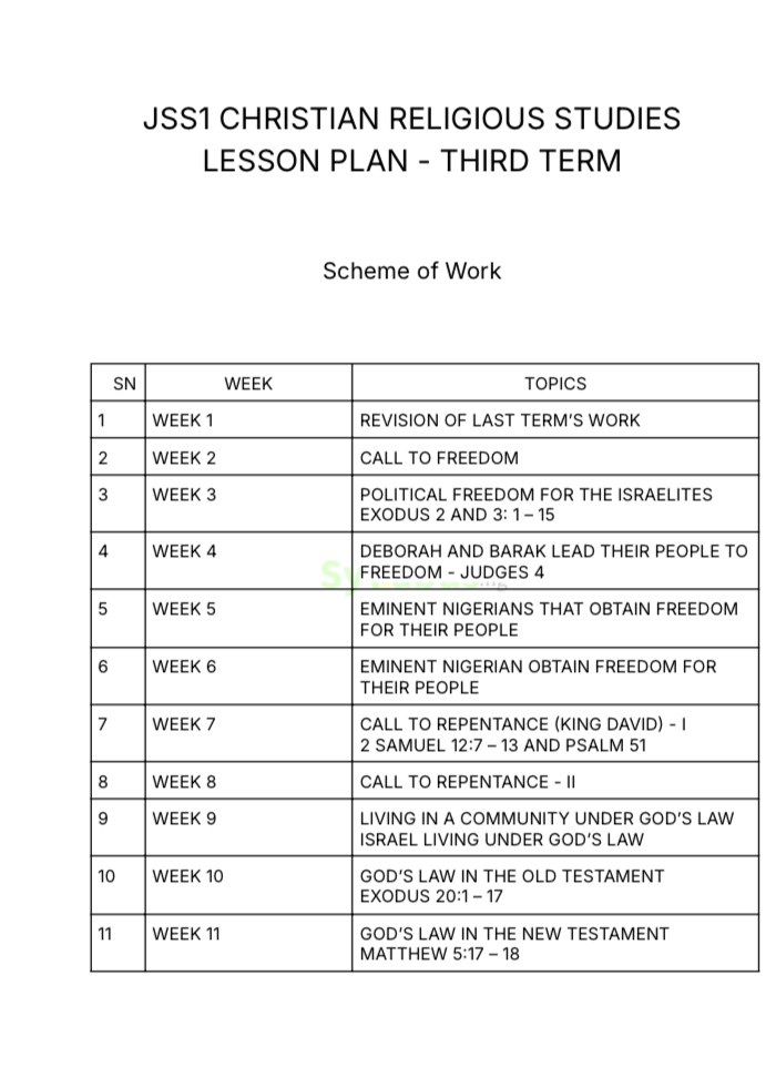 JSS1 CHRISTIAN RELIGIOUS STUDIES LESSON PLAN DESCRIPTIONS Teaching Christian Religious Studies just got easier with our JSS1 lesson plans. It is designed for teachers; these comprehensive guides cover key biblical stories and moral lessons while providing clear learning objectives, teaching strategies, and assessment tools that make your classroom instruction more effective and engaging. Our Christian Religious Studies lesson plans are thoughtfully structured to help teachers deliver meaningful lessons that connect with students. From exploring biblical figures like Joseph, Moses, and Abraham to examining relationships in family, school, and church settings, these plans provide relevant content that fosters both spiritual growth and practical application in students' lives. WHY GET OUR LESSON PLAN? Our lesson plan incorporates detailed learning objectives, key vocabulary terms, suggested teaching resources, and carefully designed activities that promote student engagement and critical thinking. The plans feature step-by-step teaching strategies, from introduction to assessment, ensuring seamless lesson delivery even for teachers new to the subject. With these comprehensive notes, you'll save valuable preparation time while delivering high-quality religious education that aligns perfectly with the curriculum. The content emphasises both biblical knowledge and character development, helping students understand core values like obedience, service, and maintaining healthy relationships.