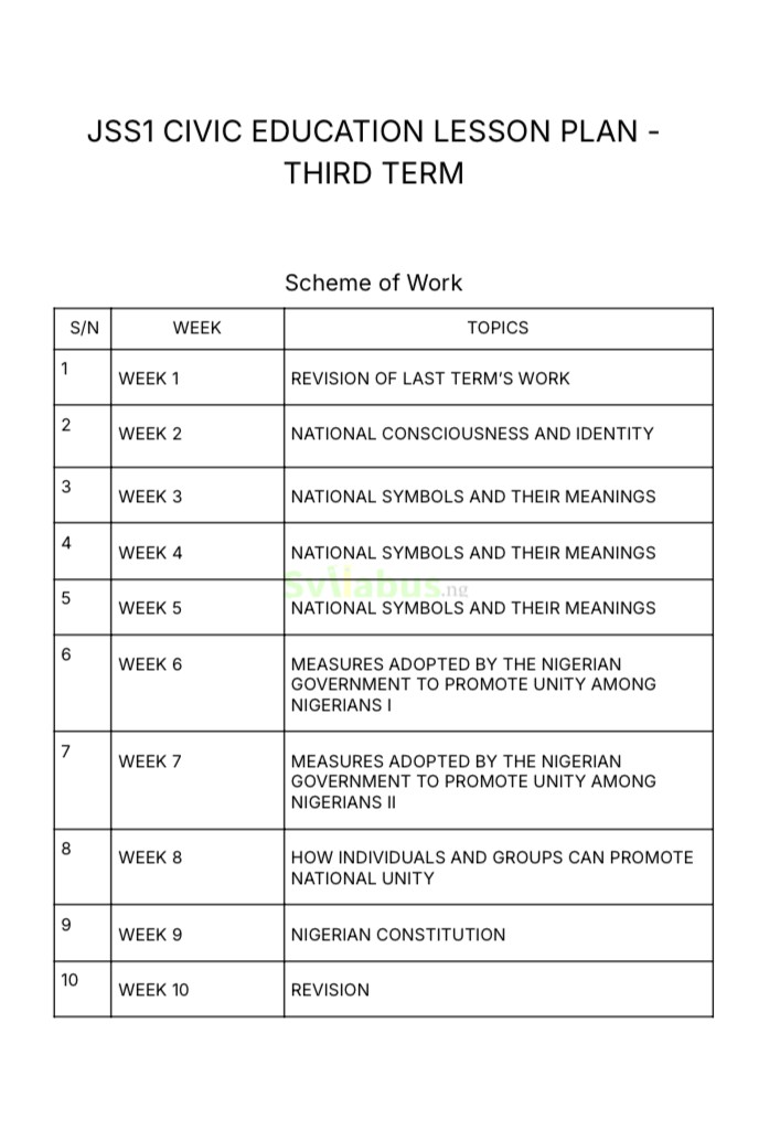 JSS1 CIVIC EDUCATION LESSON PLAN DESCRIPTIONS Our JSS1 Civic Education lesson plans provide everything you need to deliver impactful citizenship education. From defining citizenship to exploring rights and duties, these meticulously organized plans follow the standard Nigerian curriculum while making quality education accessible and relevant for junior secondary students. Each week's lesson comes with clear learning objectives, key vocabulary lists, detailed content breakdowns, and diverse teaching strategies. The plans incorporate interactive activities like role-plays, debates, group discussions, and creative assignments that encourage critical thinking and real-world application. We've included built-in assessment strategies, evaluation criteria, and comprehensive assignments to measure student understanding and progress. Save time on preparation and focus on what matters most - fostering responsible citizenship in your students!
