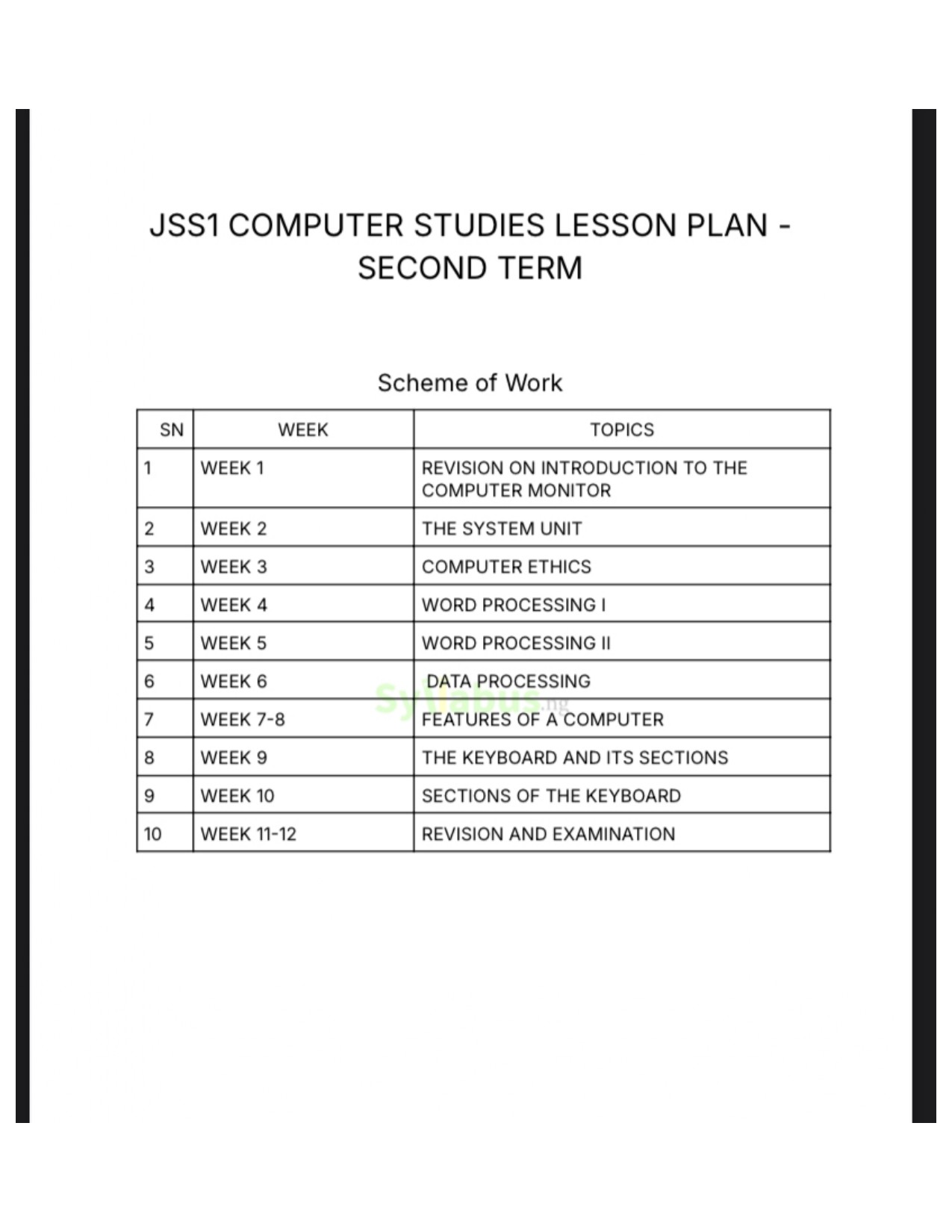 JSS1 COMPUTER STUDIES LESSON PLAN DESCRIPTIONS Teaching Computer Studies just got easier with our comprehensive JSS1 lesson plans. Designed for busy teachers, these detailed plans cover everything from computer processing to keyboard mastery, saving you hours of preparation time while ensuring engaging and effective lessons. Each lesson plan includes clear learning objectives, detailed content explanations, classroom activities, assessment questions, and homework assignments. The plans are structured to build digital literacy progressively, using practical examples that connect abstract concepts to real-world applications. WHY GET OUR LESSON PLAN? Our lesson plans cover the complete syllabus for JSS1 Computer Studies, from basic definitions to practical keyboard and mouse skills. Each lesson builds logically on previous learning, creating a coherent learning journey for your students. The lesson plans include varied teaching strategies designed to engage different learning styles and maintain student interest throughout the term. With these resources, you can focus more on classroom management and student interaction rather than lesson preparation. The included assessment tools help you track student progress effectively, while the detailed assignments encourage students to explore computer concepts beyond the classroom.