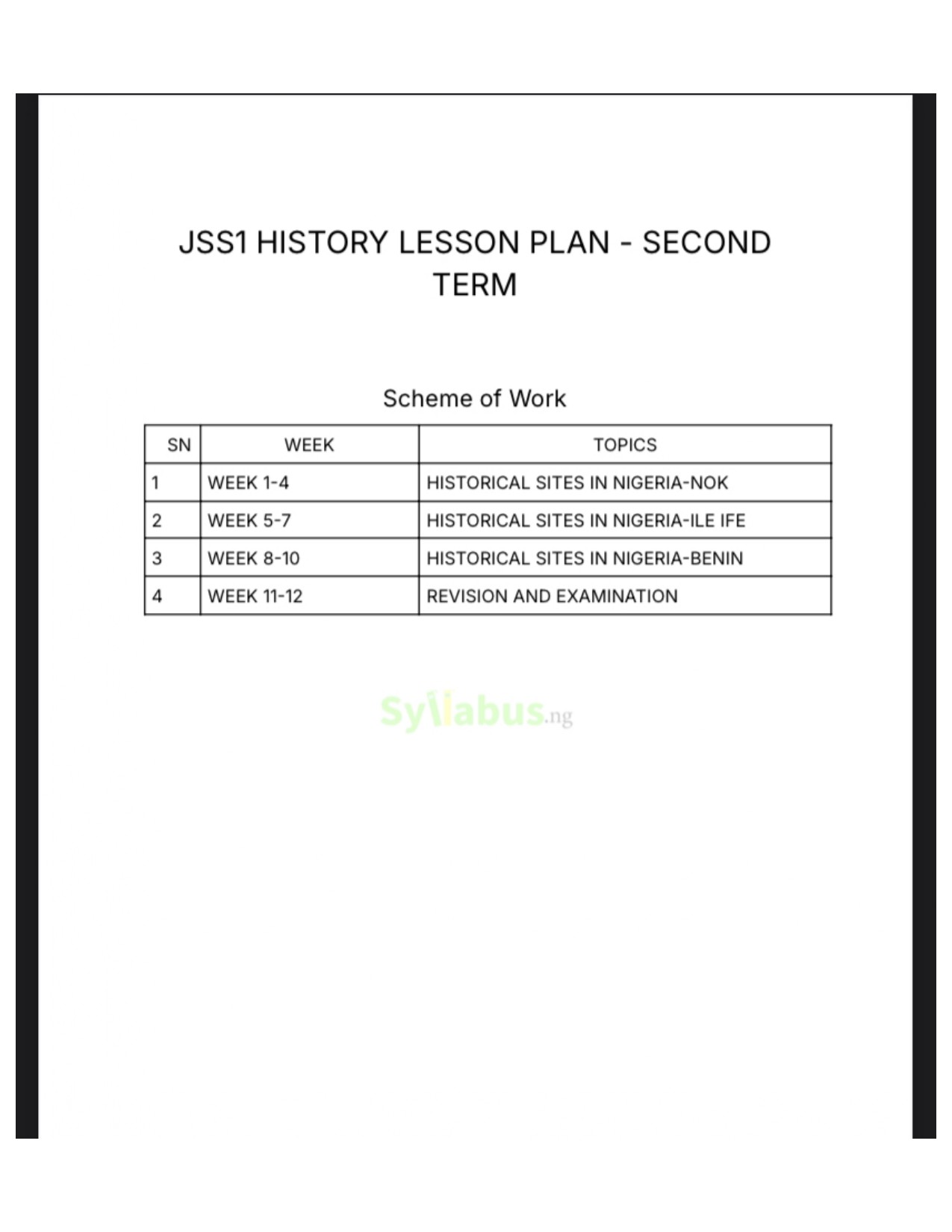 JSS1 HISTORY LESSON PLAN DESCRIPTIONS Our lesson plans feature practical teaching strategies that bring history to life in your classroom. They incorporate group activities, reflective exercises, case studies, and discussions that develop critical thinking skills. Each lesson includes detailed assessment questions and creative assignments that reinforce historical concepts. The plans also provide comprehensive resource lists, connection points to students' prior knowledge, and suggestions for supporting diverse learning needs. With these plans, you'll confidently guide your students through understanding history's meaning, exploring historical sources, and appreciating history's importance to individuals and society. Grab your copy now and make history teaching your strongest subject! WHY GET OUR LESSON PLAN? Our lesson plan covers the academic session syllabus with week-by-week breakdowns. These plans align perfectly with educational standards and save you countless hours of preparation time. Each lesson includes differentiated learning approaches for diverse student needs, from visual learners to advanced students seeking additional challenges. These comprehensive plans include everything from vocabulary development to creative assignments that connect historical concepts to students' lives. With our ready-to-use materials, you can focus on delivery rather than planning, bringing passion and energy to your teaching. Whether you're new to teaching history or an experienced educator looking for fresh approaches, these lesson plans provide a solid foundation for successful history education. They're downloadable and easy to use on any device, allowing you to prepare lessons anywhere, anytime.