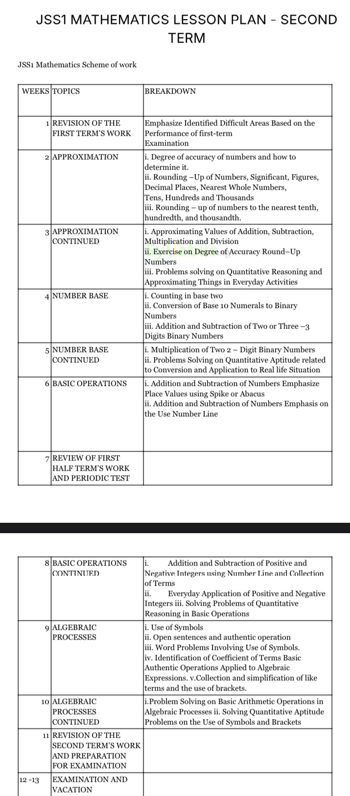 JSS1 MATHEMATICS LESSON PLAN DESCRIPTIONS The JSS1 Mathematics Lesson Plan is a comprehensive teaching guide designed to simplify math instruction for junior secondary students. It covers key topics like approximation, number bases, and algebra, ensuring students understand foundational concepts with clear objectives, activities, and assessments. WHY GET OUR LESSON PLAN? Our JSS1 Mathematics Lesson Plan is organized by week with detailed breakdowns of topics, learning objectives, and instructional materials. It also includes class exercises, group work, and real-life problem-solving tasks. Our lesson plan is packed with periodic tests, assignments, and evaluation questions to track the progress of your students. It also includes recommended learning aids and resources. This lesson plan is ideal for teachers, tutors, and homeschooling parents.