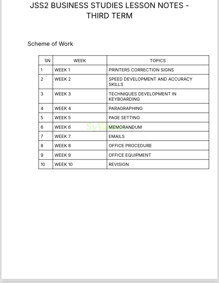 Get this JSS2 Business Studies lesson note for easy to read, teach and understand lessons. It covers all three terms and ensures you are teaching according to the curriculum. Every Business Studies teacher needs a copy of this as it is perfect for teaching students how to apply business principles in everyday situations. If you want to save time and teach Business Studies with confidence, you need a copy of this. WHY GET OUR LESSON NOTES? Teaching is one of the most fulfilling yet demanding professions, and preparing comprehensive lesson notes for every subject can take up a significant amount of your time. That is why our JSS2 Lesson Notes Ebook is a must-have for teachers who want to simplify their planning process without compromising on the quality of their lessons. This ebook provides you with well-detailed notes that align with the Nigerian curriculum, ensuring your teaching is not only efficient but also impactful. With this ebook, you will gain access to clear, step-by-step lesson plans for every subject taught in JSS2, covering all three terms. This allows you to enter the classroom well-prepared and confident, knowing that you have a well-thought-out guide to help your students achieve their learning goals. Investing in this ebook isn’t just about convenience; it’s about elevating your teaching experience and making a lasting impression on your students.
