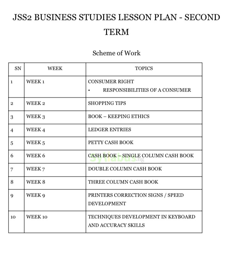 Does this lesson plan follow the Nigerian curriculum for JSS2 Business Studies?