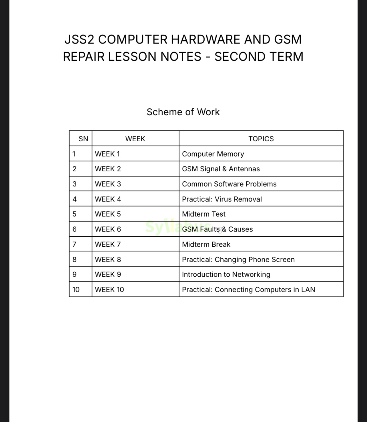 Transform your ICT teaching with this comprehensive, ready-to-use lesson note covering all three terms of JSS2 Computer Hardware and GSM Repairs. Fully aligned with Nigeria's Federal Unified Scheme of Work, this resource eliminates hours of lesson planning and ensures curriculum compliance. Each week features detailed content on essential topics including computer hardware components, GSM technology, BIOS operations, operating systems, networking fundamentals, and practical repair procedures. Lessons incorporate relatable Nigerian contexts, student-friendly explanations with everyday analogies, hands-on practical activities, and assessment questions to reinforce learning.