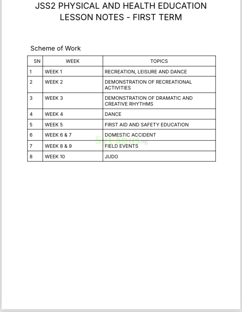 Take the stress out of exam preparation with our comprehensive JSS2 Physical and Health Education exam questions package! This carefully crafted resource provides teachers with a complete set of assessment materials aligned with the third-term curriculum. From table tennis skills to environmental health concepts, these questions cover all essential topics your students need to master. The package includes 50 meticulously designed objective questions with corresponding answers, plus 6 theory questions that test deeper understanding and application. Each question is strategically formulated to assess different learning objectives, ensuring a balanced evaluation of knowledge, comprehension, and critical thinking. These exam questions are perfect for end-of-term assessments, revision sessions, or practice tests. Whether you're a new teacher looking for guidance or an experienced educator wanting to save time, this resource provides everything you need to effectively evaluate your students' understanding of physical education and health concepts. Download your copy now and streamline your assessment process! WHY GET OUR EXAM QUESTIONS? Creating balanced, comprehensive exam questions that thoroughly assess student knowledge while covering the curriculum can be time-consuming and challenging. Our JSS2 PHE Exam Questions package solves this problem! This resource features expertly developed questions that test various aspects of physical education and health knowledge, from sports skills and rules to environmental health and personal hygiene. Each question is thoughtfully crafted to align with curriculum standards and learning objectives. The included answer key makes grading straightforward and efficient. Whether you're preparing end-of-term exams, conducting revision classes, or creating weekly quizzes, these questions provide a solid foundation that can be used directly or modified to suit your teaching approach.