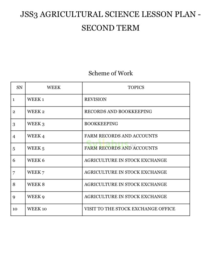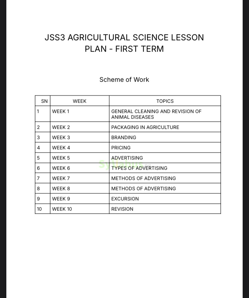JSS3 AGRICULTURAL SCIENCE LESSON PLAN DESCRIPTIONS This complete lesson plan offers teachers everything needed to deliver engaging and impactful Agricultural Science instruction to JSS3 students. Each weekly plan includes clear learning objectives, step-by-step content development sections, practical farm activities, and assessment strategies that ensure students develop both theoretical knowledge and practical agricultural skills. The lesson plans are designed to promote not just academic understanding but also practical application of agricultural principles in real farming situations. WHY GET OUR LESSON PLAN? Teaching Agricultural Science requires balancing classroom theory with practical farm skills. Our lesson plans make this easier by providing well-structured guides that engage students while thoroughly covering the curriculum. Each lesson includes clear explanations, practical demonstrations, and activities that build agricultural competencies. Save hours of preparation time and deliver more effective lessons with our comprehensive resources.