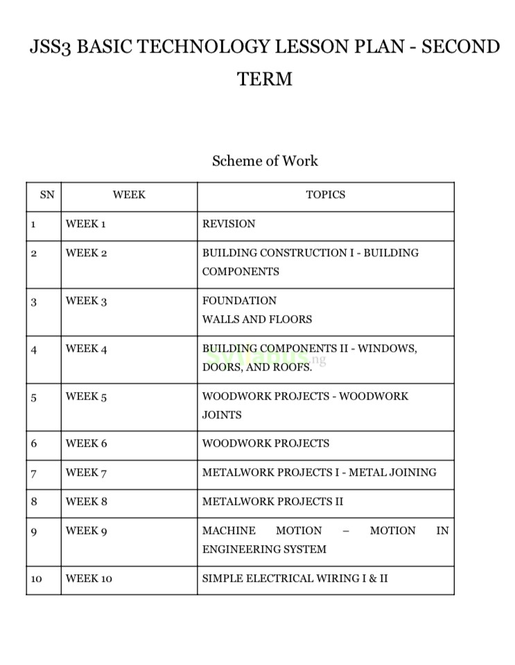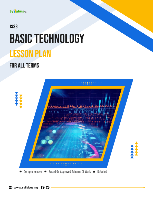 JSS3 BASIC TECHNOLOGY LESSON PLAN DESCRIPTIONS Our detailed, ready-to-use lesson guides cover essential topics like technical drawing, woodwork, metalwork, simple machines, and basic electronics. This complete lesson plan package offers teachers everything needed to deliver engaging and impactful Basic Technology instruction to JSS3 students. Each weekly plan includes clear learning objectives, step-by-step technical instructions, workshop activities, and assessment strategies that ensure students develop both theoretical knowledge and practical technical skills. The lesson plans are designed to promote not just academic understanding but also real-world application of technological principles in everyday situations. WHY GET OUR LESSON PLAN? Teaching Basic Technology requires balancing technical concepts with workshop practice. Our lesson plans make this easier by providing well-structured guides that engage students while thoroughly covering the curriculum. Each lesson includes clear explanations, safety guidelines, practical demonstrations, and activities that build technical competence. Save hours of preparation time and deliver more effective lessons with our comprehensive resources.Â