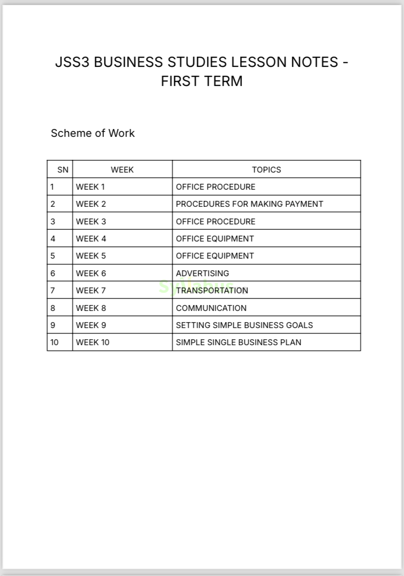 Prepare your students for the world of work with our JSS3 Business Studies Lesson Notes! These notes are your go-to guide for teaching topics like bookkeeping, entrepreneurship, trade, office procedures, and career opportunities. Designed to be simple and practical, each lesson includes detailed explanations, examples, and practice activities that build students’ understanding of business concepts. The notes also feature case studies and real-world scenarios to help your students see how what they learn applies in real life. With these lesson notes, your students will gain valuable knowledge that prepares them for future academic and career paths, while you as a teacher will enjoy a smoother teaching experience with less prep time. Empower your students with the tools they need to thrive in the business world! WHY GET OUR LESSON NOTES? Teaching can be challenging, especially when you're juggling lesson planning, grading, and classroom management. But our JSS3 Lesson Notes eBook takes the pressure off your shoulders. It provides you with detailed, ready-to-use lesson plans that are aligned with the curriculum and easy to follow. These notes are structured to help you teach with confidence, engage your students, and track their progress. With these notes, you will save hours of preparation time and have more energy to focus on what truly matters—helping your students succeed. Plus, they are designed to be adaptable to your teaching style and classroom needs. Let us handle the planning while you shine in the classroom!