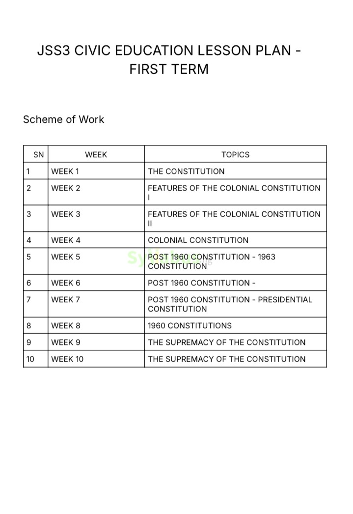 JSS3 CIVIC EDUCATION LESSON PLAN DESCRIPTIONS Save precious planning time with detailed, ready-to-use lesson plans covering essential topics like citizenship, democracy, human rights, national values, and governance. This complete lesson plan package offers teachers everything needed to deliver engaging and impactful Civic Education instruction to JSS3 students. Each weekly plan includes clear learning objectives, step-by-step content development sections, interactive classroom activities, and assessment strategies that ensure students develop good citizenship values. The lesson plans are designed to promote not just academic understanding but also practical application of civic knowledge in students' daily lives as responsible citizens. WHY GET OUR LESSON PLAN? Teaching Civic Education requires balancing theoretical concepts with practical nation-building skills. Our lesson plans make this easier by providing well-structured guides that engage students while thoroughly covering the curriculum. Each lesson includes clear explanations, practical examples from Nigerian society, and activities that build civic awareness and participation skills. Save hours of preparation time and deliver more effective lessons with our comprehensive resources.