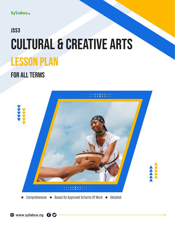 JSS3 CULTURAL AND CREATIVE ARTS LESSON PLAN DESCRIPTIONS Download our complete lesson plan package, it offers teachers everything needed to deliver engaging and impactful Cultural and Creative Arts instruction to JSS3 students. Each weekly plan includes clear learning objectives, step-by-step content development sections, hands-on creative activities, and assessment strategies that ensure students develop both artistic skills and cultural appreciation. The lesson plans are designed to promote not just technical proficiency but also creative expression and preservation of Nigeria's rich cultural heritage. WHY GET OUR LESSON PLAN? Teaching Cultural and Creative Arts requires balancing artistic techniques with cultural knowledge. Our lesson plans make this easier by providing well-structured guides that engage students while thoroughly covering the curriculum. Each lesson includes clear instructions, cultural examples, and creative projects that build artistic confidence. Save hours of preparation time and deliver more effective lessons with our comprehensive resources.