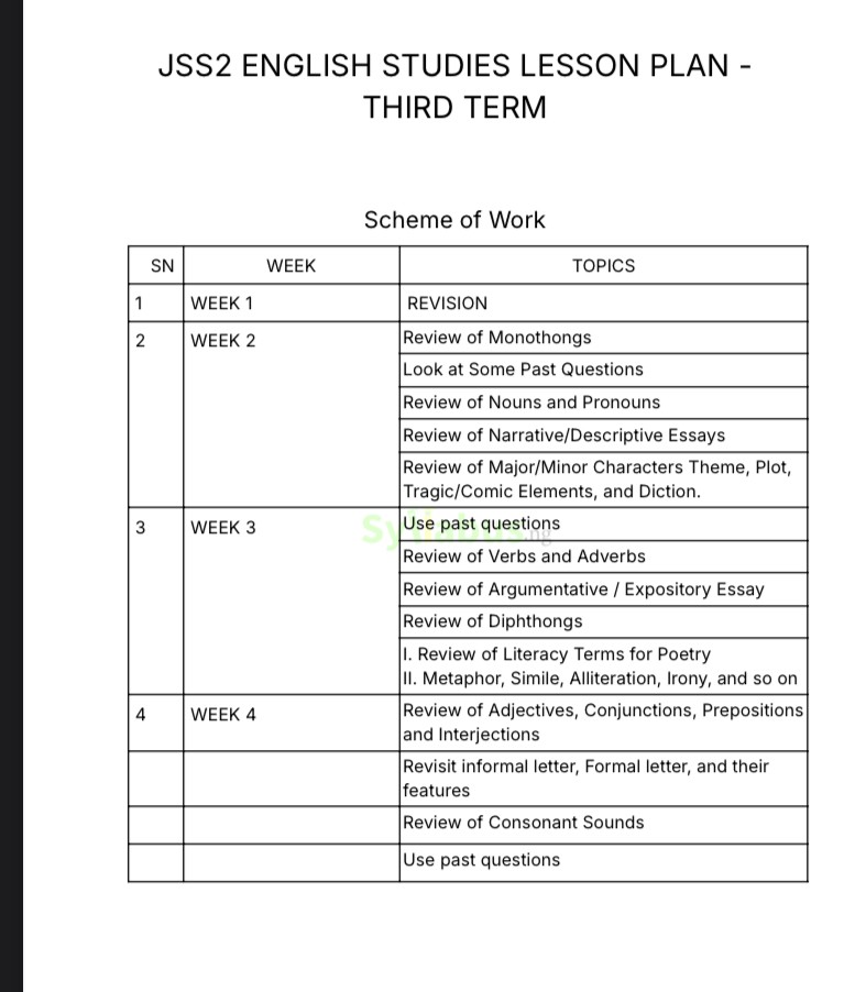 JSS3 ENGLISH STUDIES LESSON PLAN DESCRIPTIONS Our lesson plan package offers teachers everything needed to deliver engaging and impactful English instruction to JSS3 students. Each weekly plan includes clear learning objectives, step-by-step content development sections, interactive classroom activities, and assessment strategies that ensure students develop critical language skills. The lesson plans are designed to promote not just academic understanding but also practical application of English language skills in students' daily communication. WHY GET OUR LESSON PLAN? Teaching English Studies requires balancing language skills with literary appreciation. Our lesson plans make this easier by providing well-structured guides that engage students while thoroughly covering the curriculum. Each lesson includes clear explanations, practical examples, and activities that build reading, writing speaking and listening skills. Save hours of preparation time and deliver more effective lessons with our comprehensive resources.