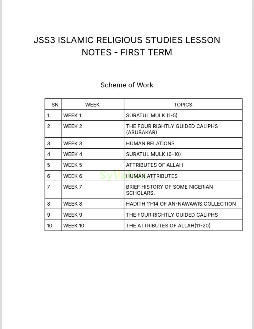 Make your teachings easy and improve your students’ understanding of Islamic principles with our JSS3 Islamic Religious Studies (IRS) Lesson Notes. Covering all topics for the session like acts of worship, the life of the Prophet Muhammad (PBUH), family values, and Islamic ethics, these notes are written to align with the curriculum while making lessons relatable and practical. WHY GET OUR LESSON NOTES? Teaching can be challenging, especially when you're juggling lesson planning, grading, and classroom management. But our JSS3 Lesson Notes eBook takes the pressure off your shoulders. It provides you with detailed, ready-to-use lesson plans that are aligned with the curriculum and easy to follow. These notes are structured to help you teach with confidence, engage your students, and track their progress. With these notes, you will save hours of preparation time and have more energy to focus on what truly matters—helping your students succeed. Plus, they’re designed to be adaptable to your teaching style and classroom needs. Let us handle the planning while you shine in the classroom!