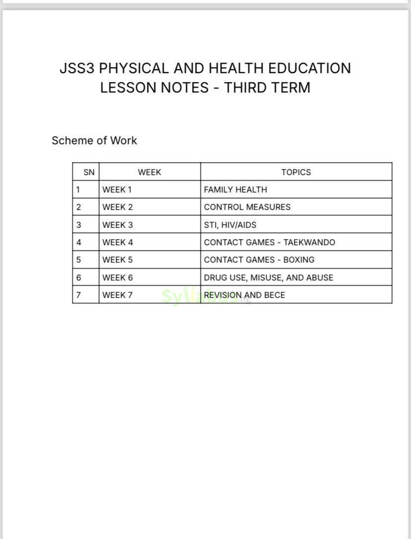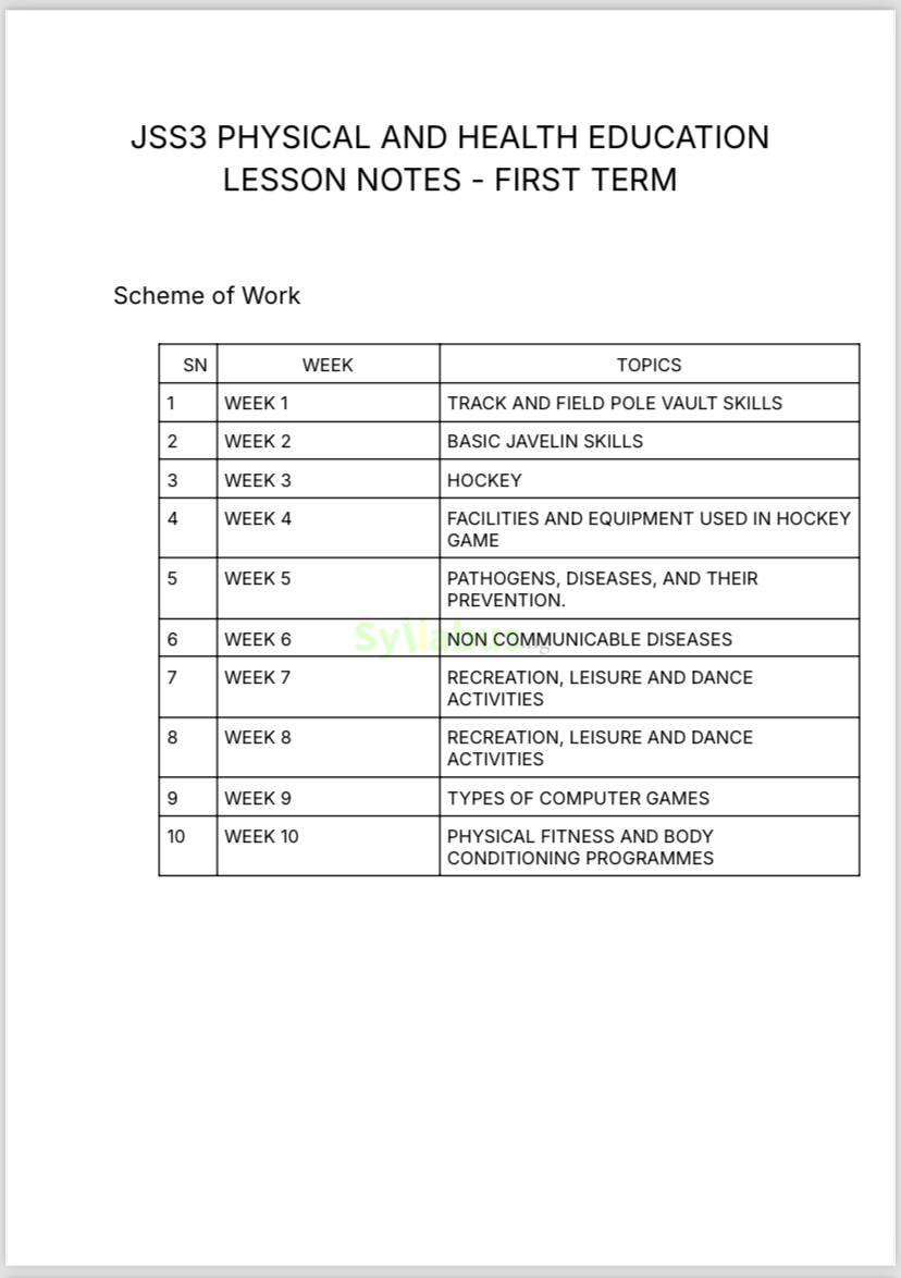 JSS3 PHYSICAL AND HEALTH EDUCATION EXAM QUESTIONS DESCRIPTION Prepare your JSS3 students for success with our comprehensive Physical and Health Education (PHE) exam questions package! This carefully crafted collection covers all essential topics, including pole vault, javelin throw, hockey fundamentals, communicable and non-communicable diseases, physical fitness, and recreational activities. The package features 50 objective questions with multiple-choice answers and 8 detailed theory questions designed to test your students' comprehensive understanding of key PHE concepts. Each question has been thoughtfully developed to align with the current JSS3 PHE curriculum, making this an invaluable resource for effective exam preparation. Whether you're creating mock exams, planning revision sessions, or looking for quality assessment materials, these questions offer the perfect balance of practical knowledge testing and theoretical understanding that JSS3 students need to excel in their Physical and Health Education examinations. WHY GET OUR EXAM QUESTIONS? Teaching Physical and Health Education effectively requires high-quality assessment tools that truly evaluate students' understanding. Our exam questions package delivers exactly what you need! Each question has been carefully developed to: