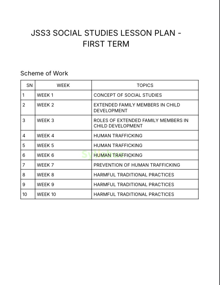 JSS3 SOCIAL STUDIES LESSON PLAN DESCRIPTIONS Save precious planning time with detailed, ready-to-use lesson guides covering essential topics like peaceful living, social conflicts, and conflict resolution strategies. This complete lesson plan package offers teachers everything needed to deliver engaging and impactful Social Studies instruction to JSS3 students. Each weekly plan includes clear learning objectives, step-by-step content development sections, interactive classroom activities, and assessment strategies that ensure students develop critical thinking skills about social issues. The lesson plans are designed to promote not just academic understanding but also practical application of conflict resolution skills in students' daily lives. WHY GET OUR LESSON PLAN? Teaching Social Studies requires balancing theoretical concepts with practical life skills. Our lesson plans make this easier by providing well-structured guides that engage students while thoroughly covering the curriculum. Each lesson includes clear explanations, practical examples, and activities that build social awareness and conflict resolution skills. Save hours of preparation time and deliver more effective lessons with our comprehensive resources.