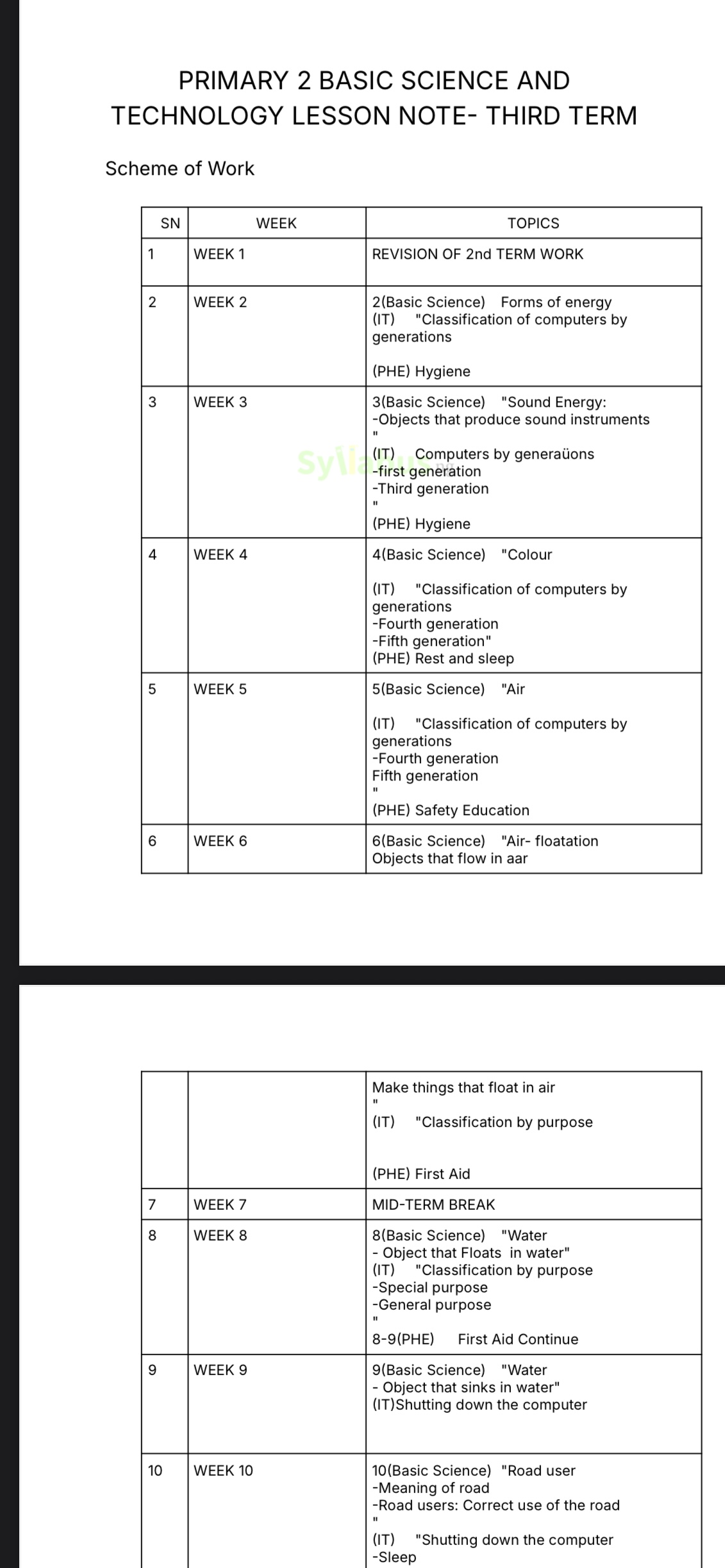 Save valuable time and enhance your teaching effectiveness with our comprehensive Primary 2 Basic Science and Technology Lesson Note. Specially designed for Nigerian educators, this professional teaching resource is meticulously aligned with both the State Unified and NAPPS (National Association of Proprietors of Private Schools) Scheme of Work, ensuring complete curriculum compliance. What's Inside: This ready-to-use lesson note provides well-structured, detailed lesson plans that cover the entire Primary 2 Basic Science and Technology curriculum. Each lesson is thoughtfully crafted with clear learning objectives, engaging teaching methods, practical activities, and effective assessment strategies. The content spans all key topics including basic science concepts, introductory technology principles, and foundational physical education components appropriate for Primary 2 learners.