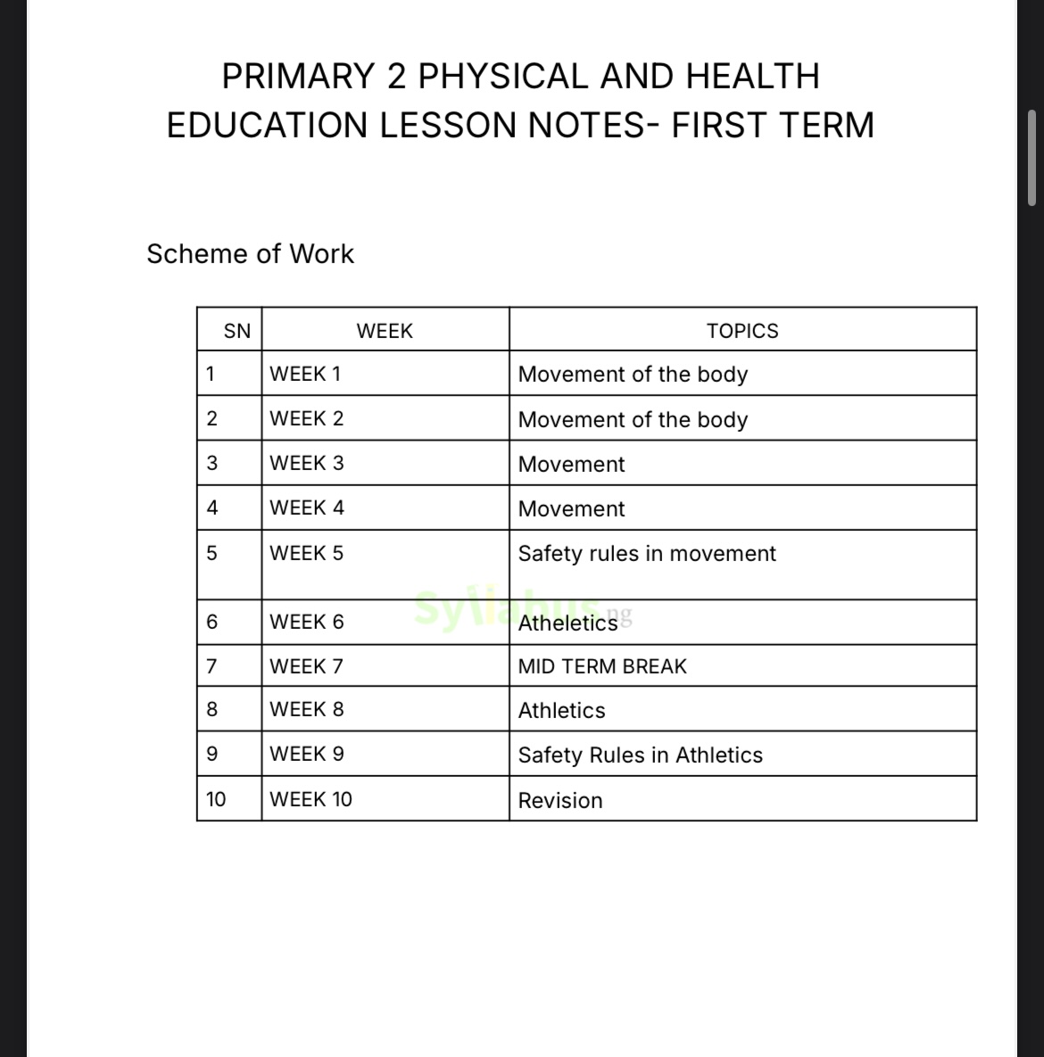This comprehensive Primary 2 Physical and Health Education Lesson Note is your essential teaching companion, meticulously designed for Nigerian educators who demand excellence without the burden of endless preparation. Fully aligned with both the State Unified Scheme of Work and NAPPS curriculum standards, this resource delivers complete, ready-to-teach lesson plans for all three academic terms. What's Included: First Term: Movement fundamentals (walking, running, jumping, galloping, skipping), athletics (50m and 75m dash, long jump), and essential safety rules for physical activities. Second Term: Basketball skills (dribbling, passing, shooting), basketball safety, swimming fundamentals, swimming strokes (freestyle, backstroke, breaststroke, butterfly), and comprehensive water safety protocols. Third Term: Health and hygiene (water purification, hand washing), rest and sleep practices, comprehensive safety education, detailed first aid procedures, and road safety for young learners. Key Features: