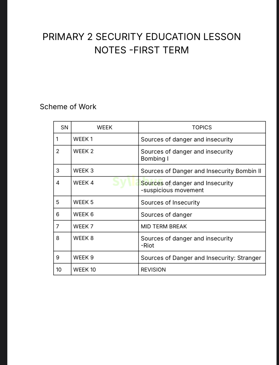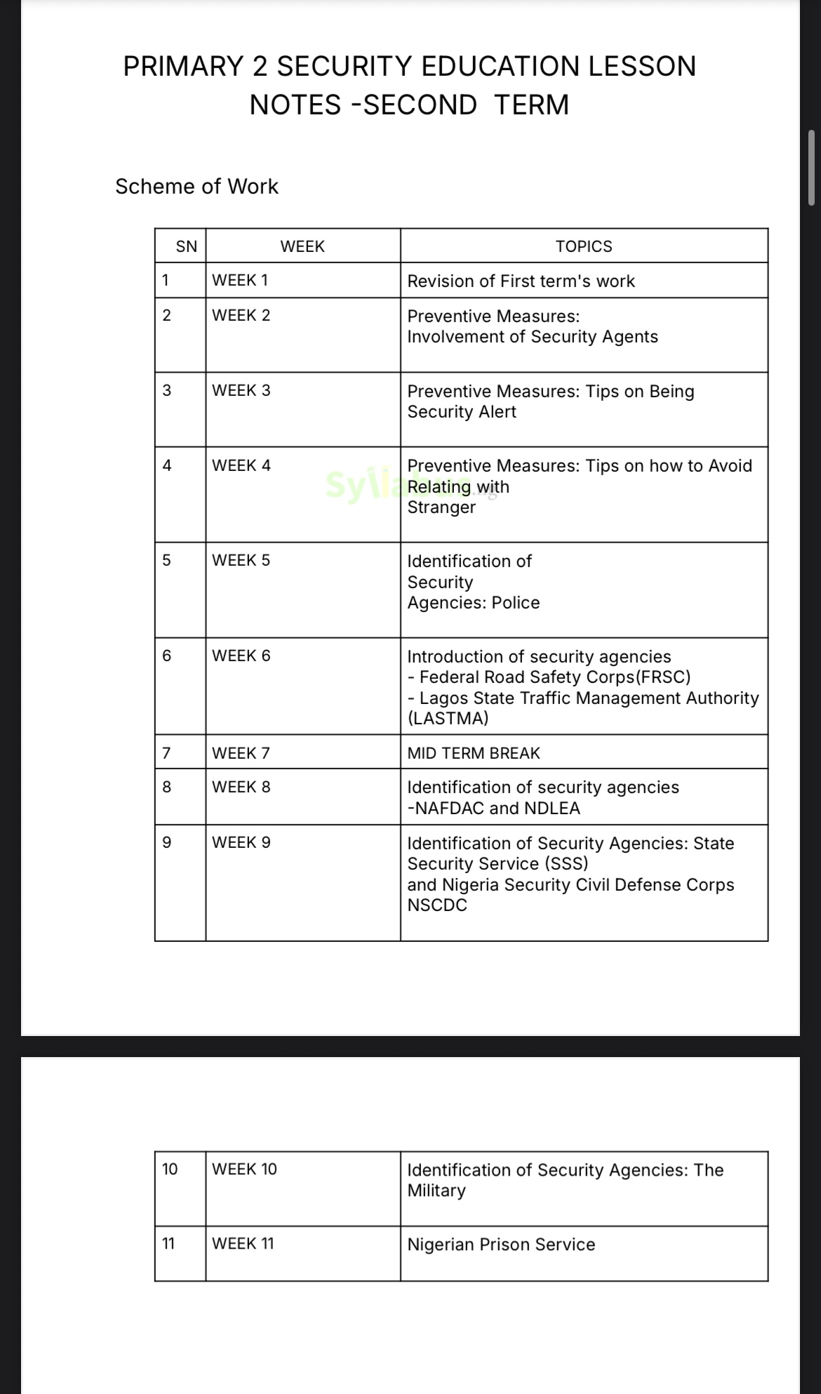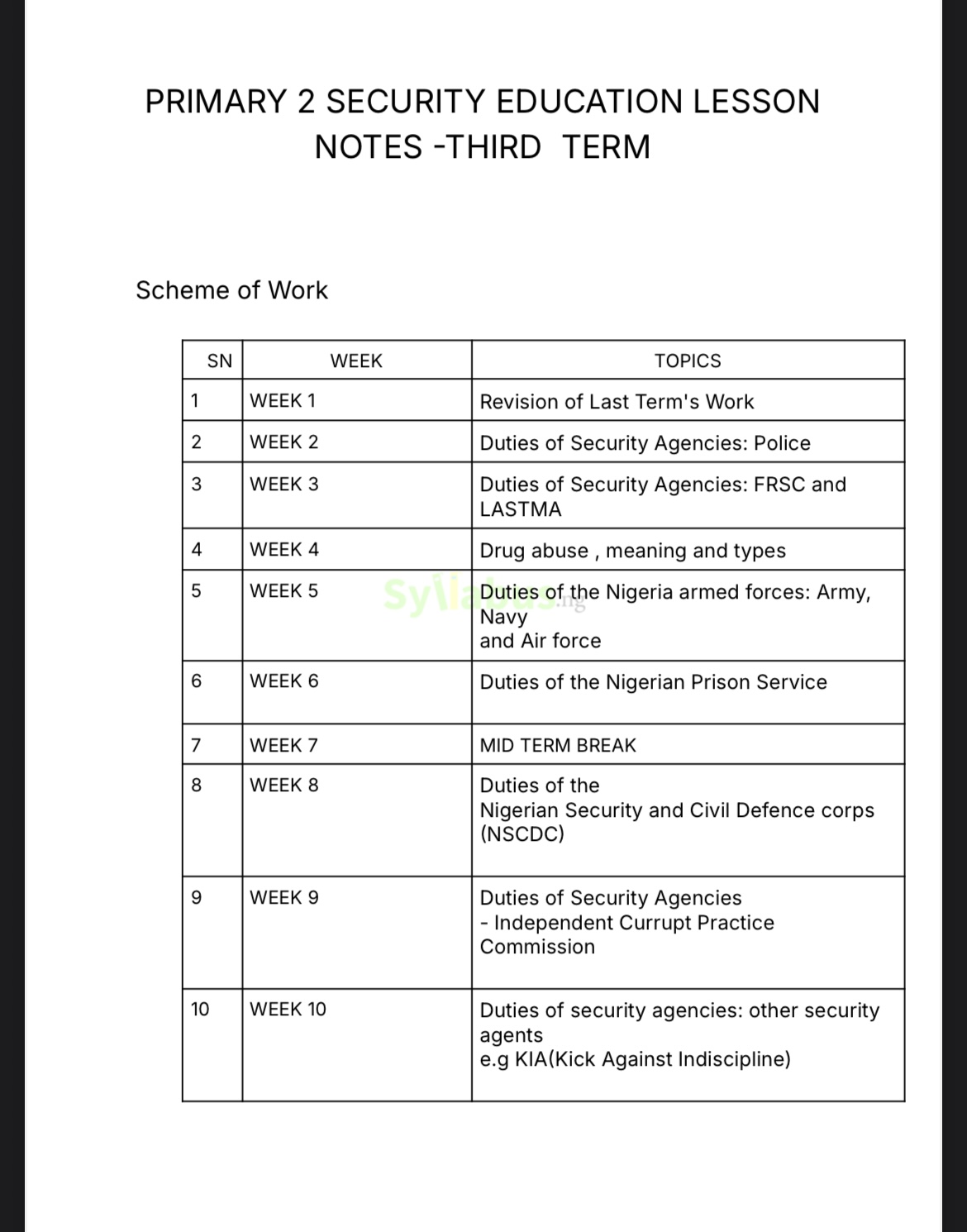 Comprehensive Teaching Resource for Nigerian Educators Transform your classroom preparation with our meticulously crafted Primary 2 Security Education Lesson Note – the ultimate time-saving solution for busy educators across Nigeria. Why Choose This Lesson Note? Designed specifically for Primary 2 teachers, this comprehensive resource eliminates hours of lesson planning by providing ready-to-use, professionally structured lesson notes that align perfectly with both the State Unified Scheme of Work and NAPPS (Nigerian Association of Proprietors of Private Schools) curriculum standards. What's Inside? This lesson note covers the complete Security Education curriculum for Primary 2 students, including: