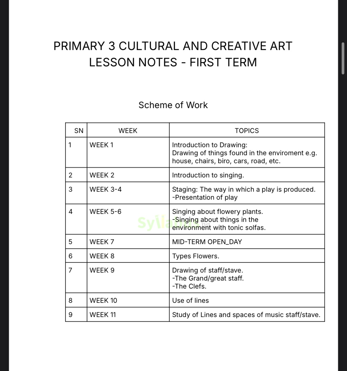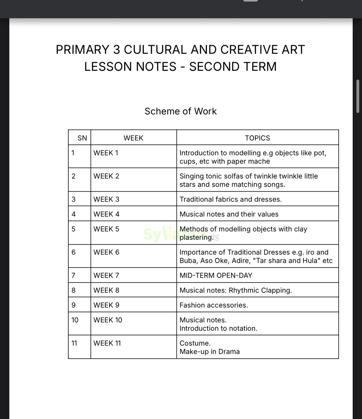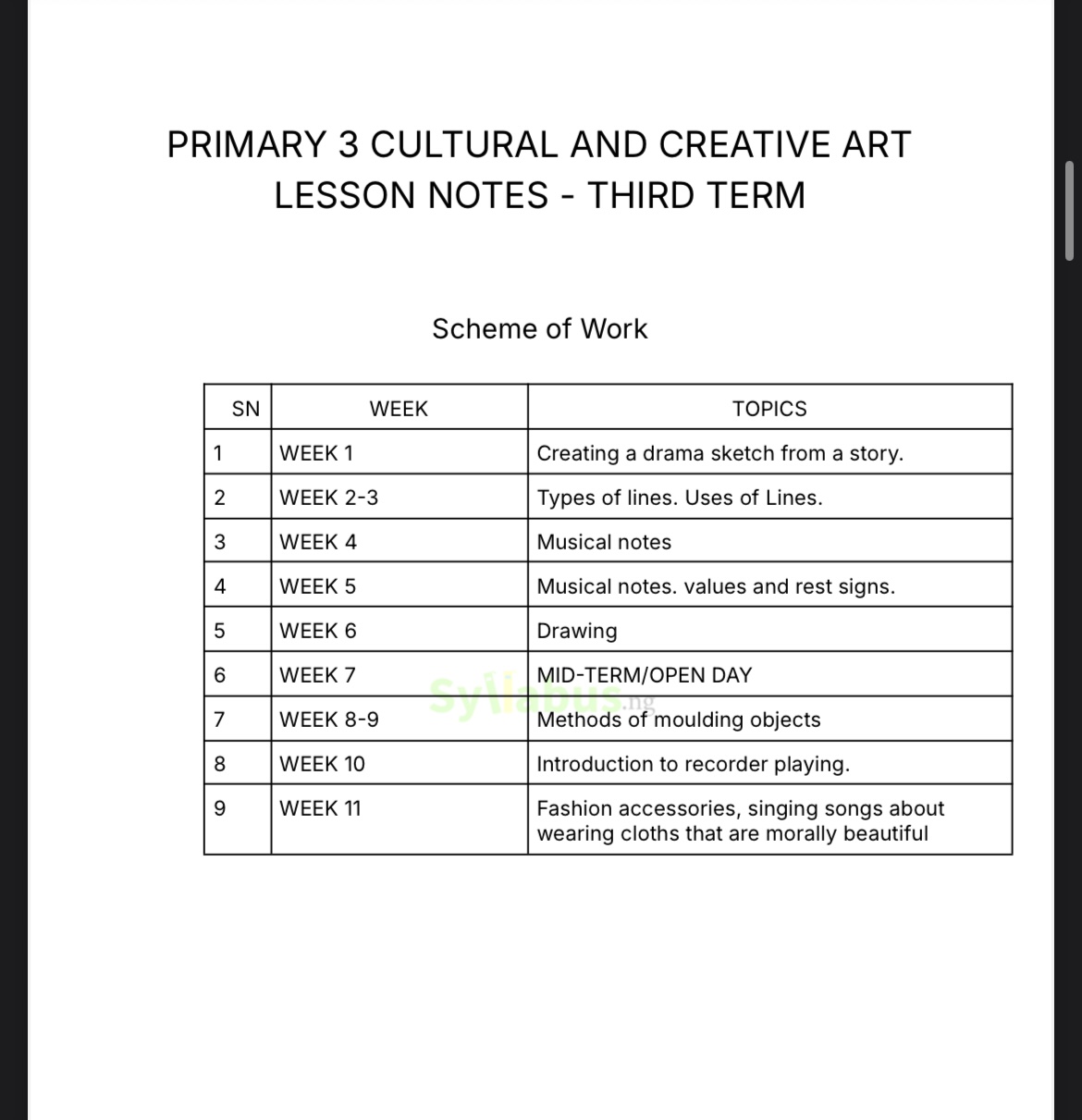 Specially designed for Nigerian educators, this complete Primary 3 Cultural and Creative Arts lesson notes package is fully aligned with the State Unified and NAPPS scheme of work. Transform your teaching experience while nurturing young artists, musicians, and performers with ready-to-use, expertly crafted lessons.