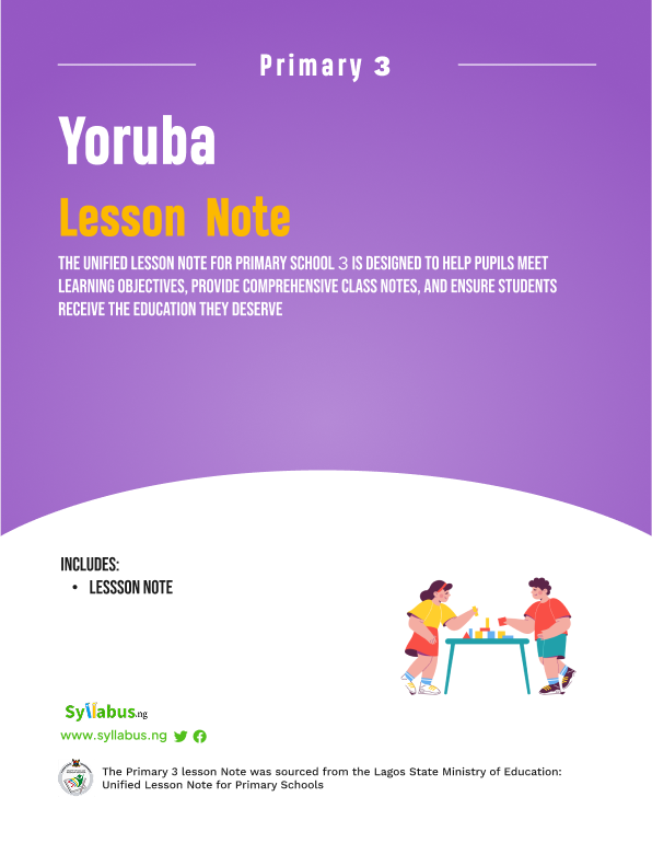 The Primary 3 Yoruba Lesson Note is a comprehensive digital teaching guide designed according to the Lagos State Unified Scheme of Work and NAPPS curriculum in Nigeria. It covers all three terms—First, Second, and Third—providing well-structured weekly lesson plans that make teaching and learning seamless for both teachers and pupils. Each lesson is carefully crafted to include learning objectives, classwork, activities, evaluations, and homework that promote understanding and cultural awareness.