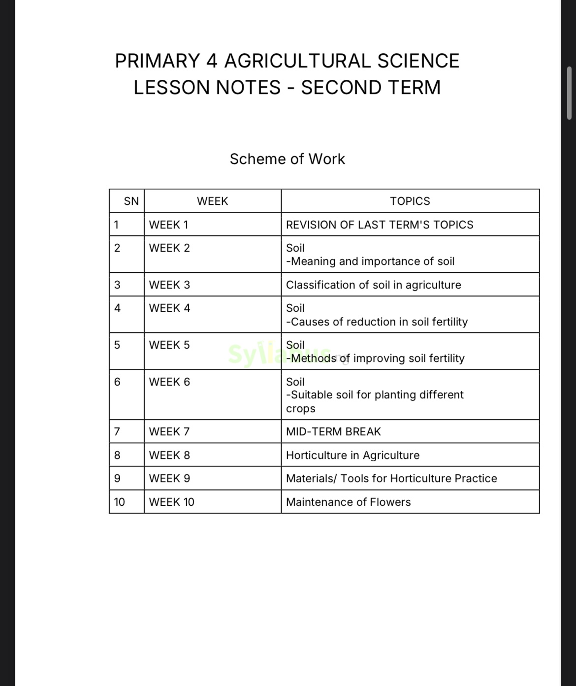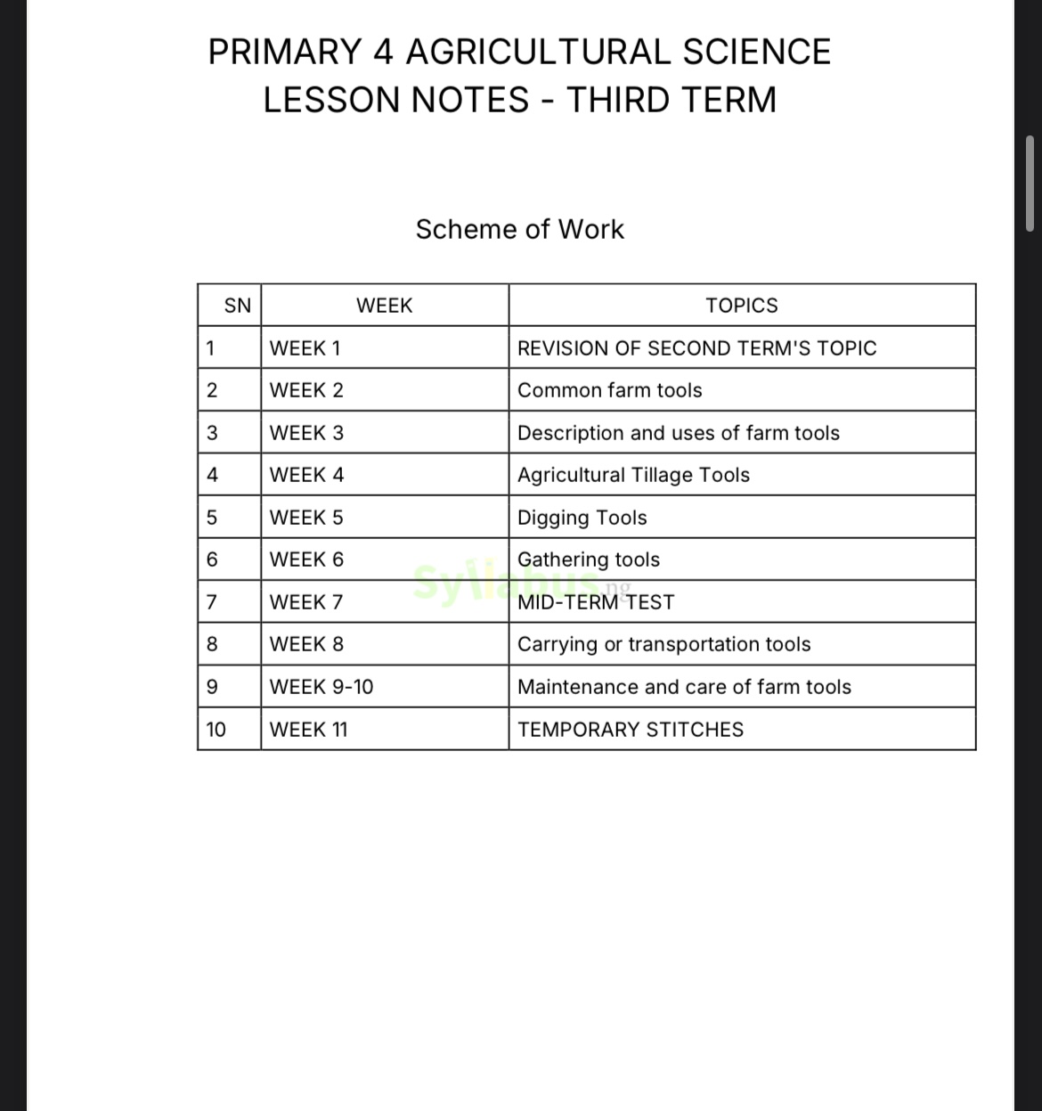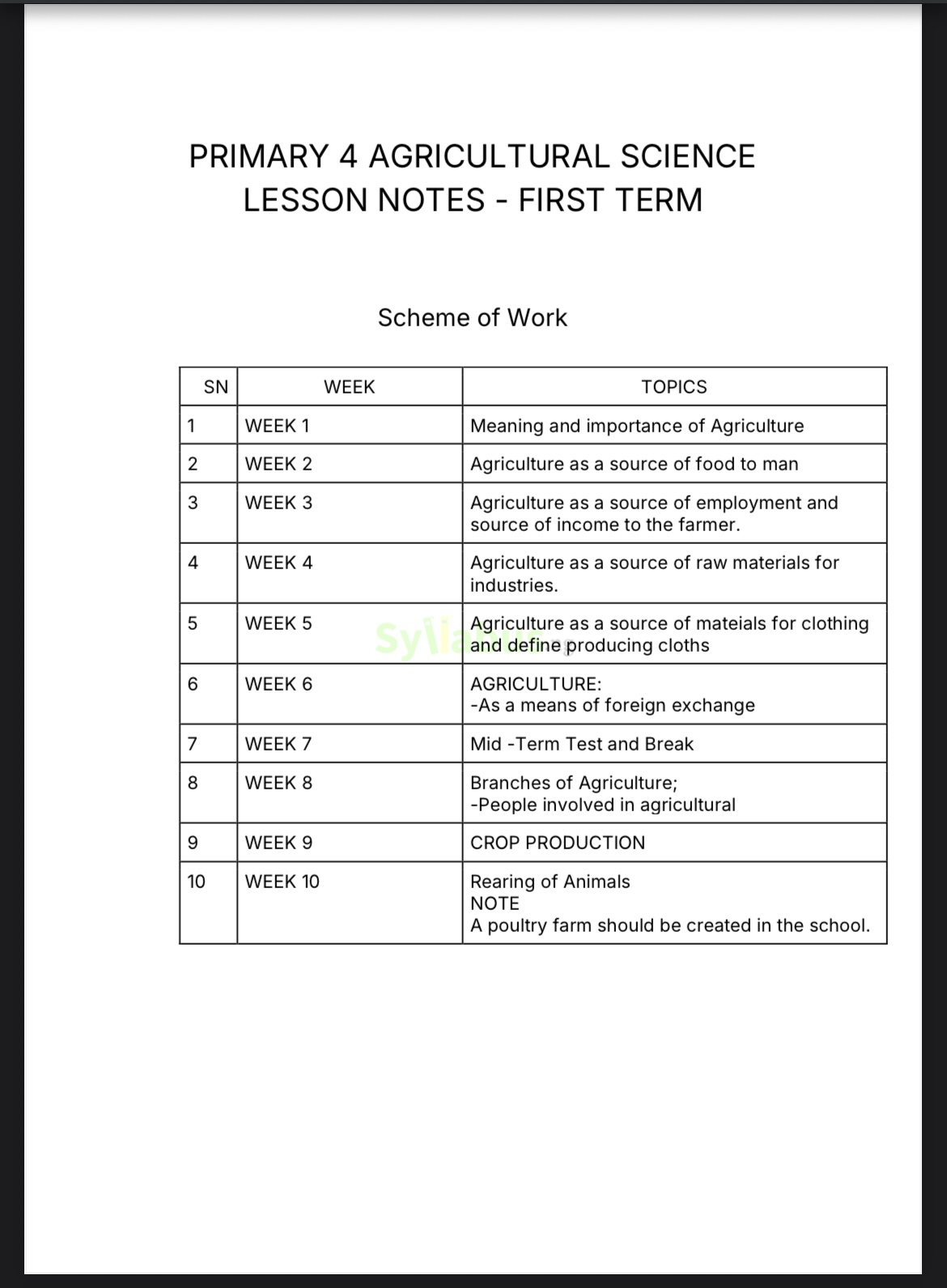 Transform your teaching experience with this comprehensive Agricultural Science Lesson Note designed for Primary 4 educators across Nigeria. Fully aligned with the Lagos State Ministry of Education Unified Scheme of Work and NAPPS curriculum standards. What's Included: Complete lesson notes covering all three terms with practical agricultural topics including crop production, animal husbandry, soil science, horticulture, and farm tools management. Each week features detailed content, real-world examples, hands-on exercises, and age-appropriate assessments. Key Topics Covered: