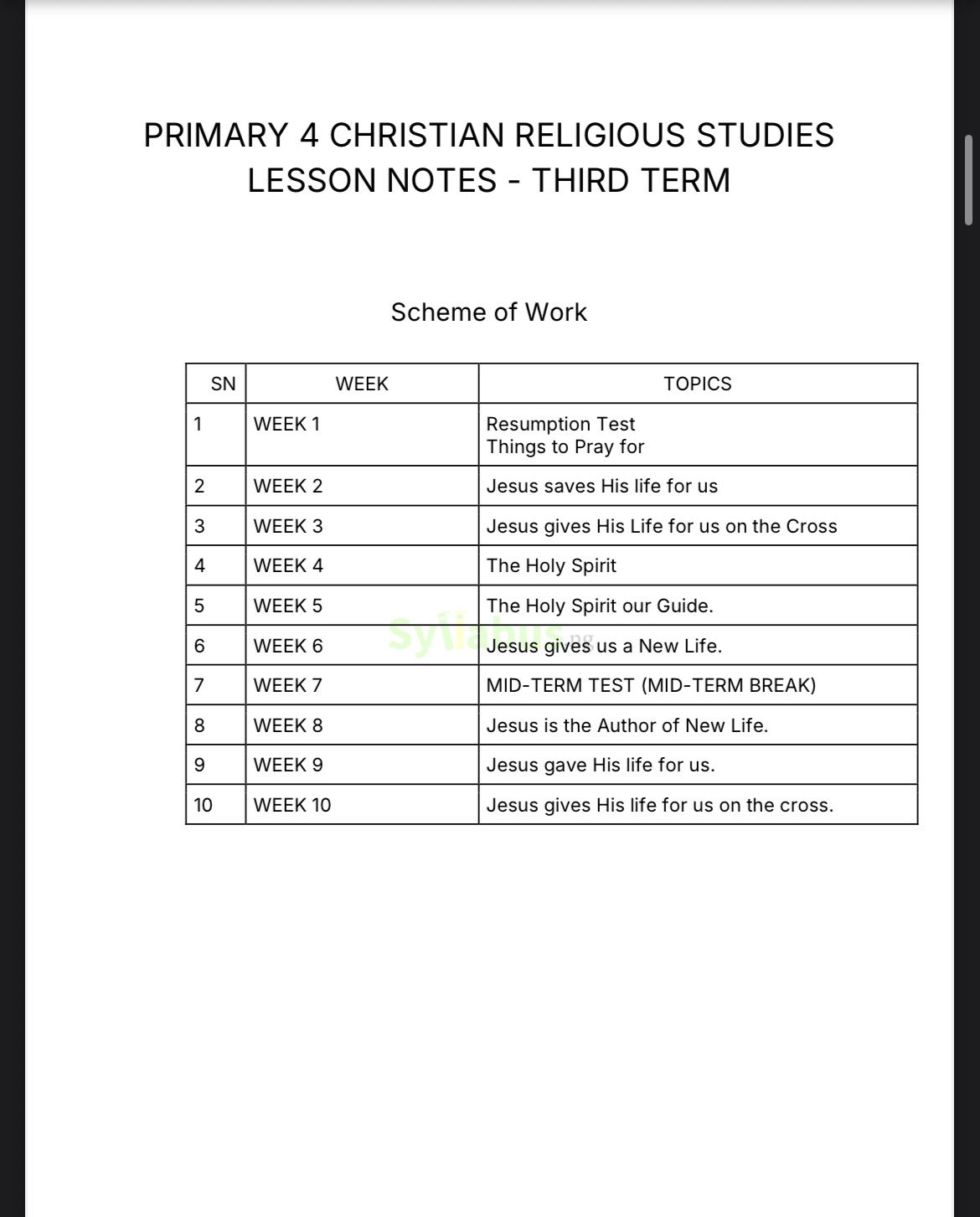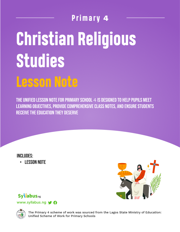 Save valuable time and enhance your teaching with our comprehensive Primary 4 Christian Religion Studies Lesson Notes! Designed specifically for Nigerian educators, this complete resource aligns perfectly with the State Unified and NAPPS Scheme of Work.