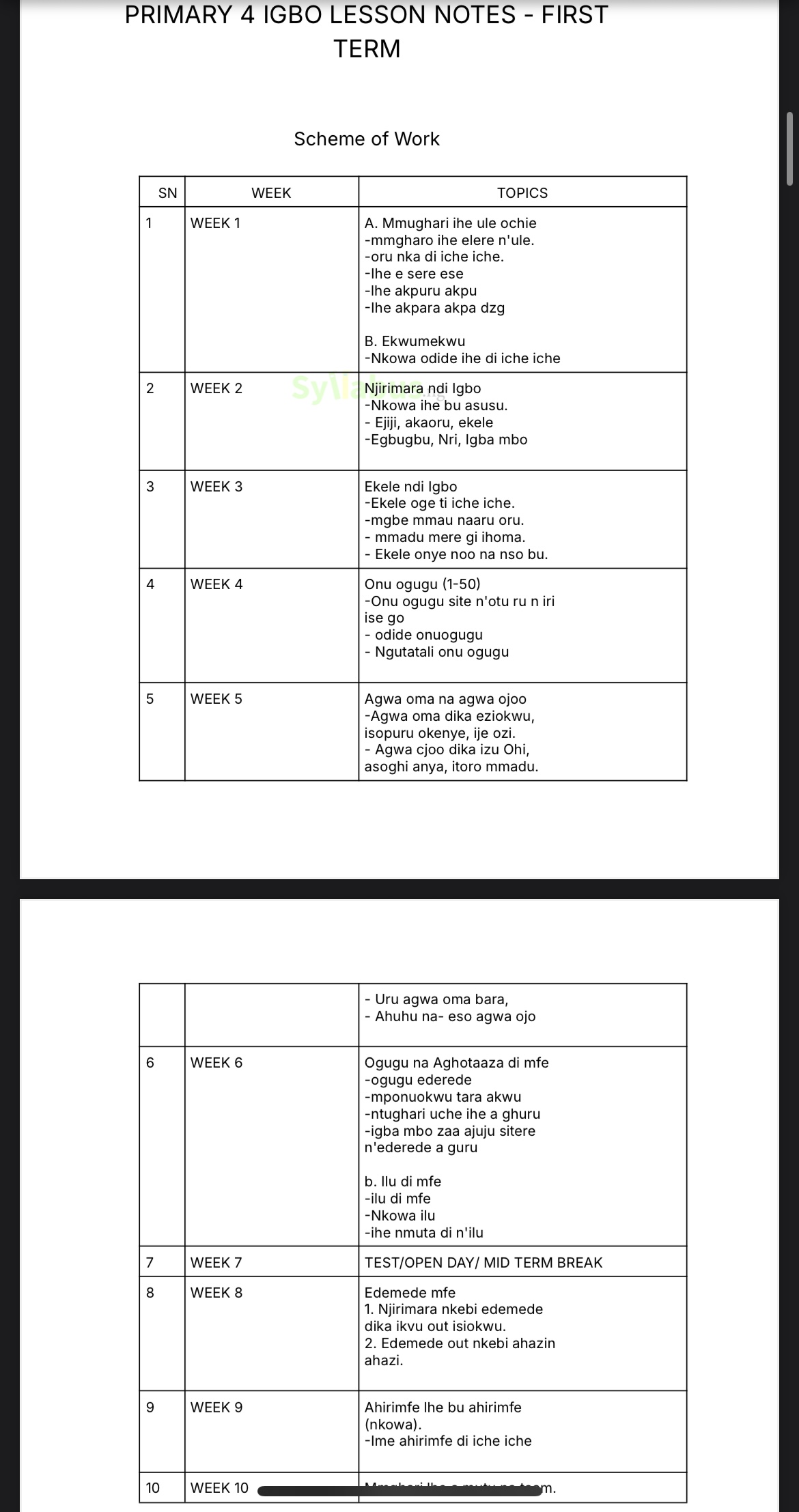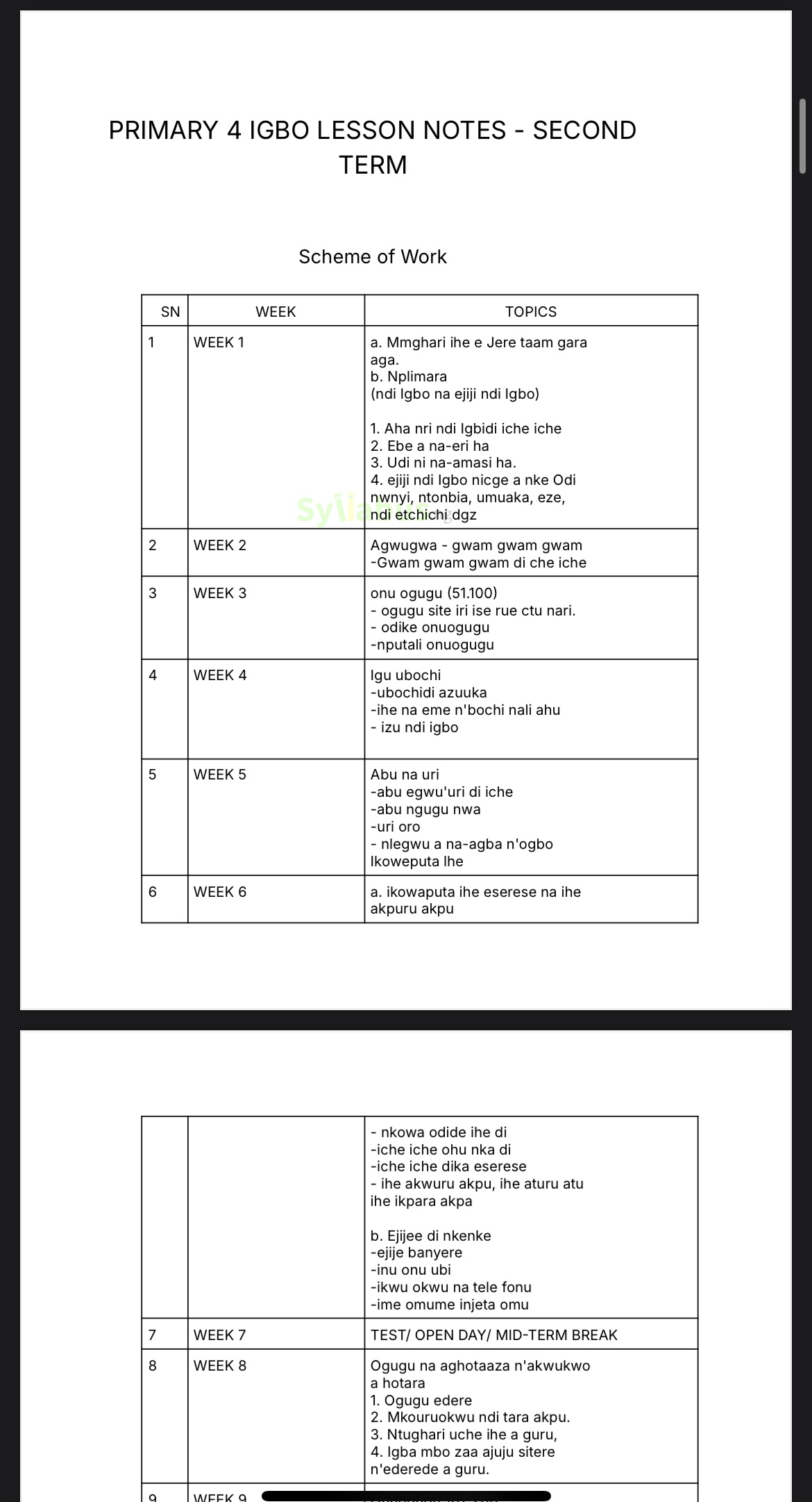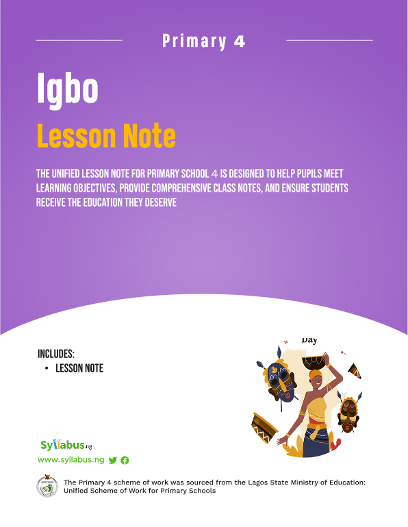 Preserve Culture. Teach Effortlessly. Inspire Excellence. This comprehensive Primary 4 Igbo Language Lesson Note is your complete teaching solution, expertly crafted to eliminate lesson planning stress while delivering authentic cultural education and language mastery. What You Get: ✅ Complete 3-Term Coverage - First to Third Term fully developed with detailed content ✅ Curriculum-Aligned - 100% compliant with State Unified and NAPPS Scheme of Work in Nigeria ✅ Ready-to-Use - Download, print, and start teaching immediately ✅ Culturally Rich - Authentic Igbo language, traditions, customs, and values ✅ Comprehensive Exercises - Practice activities, stories, poems, and assessment questions included ✅ Progressive Learning - Age-appropriate progression from basic to advanced concepts