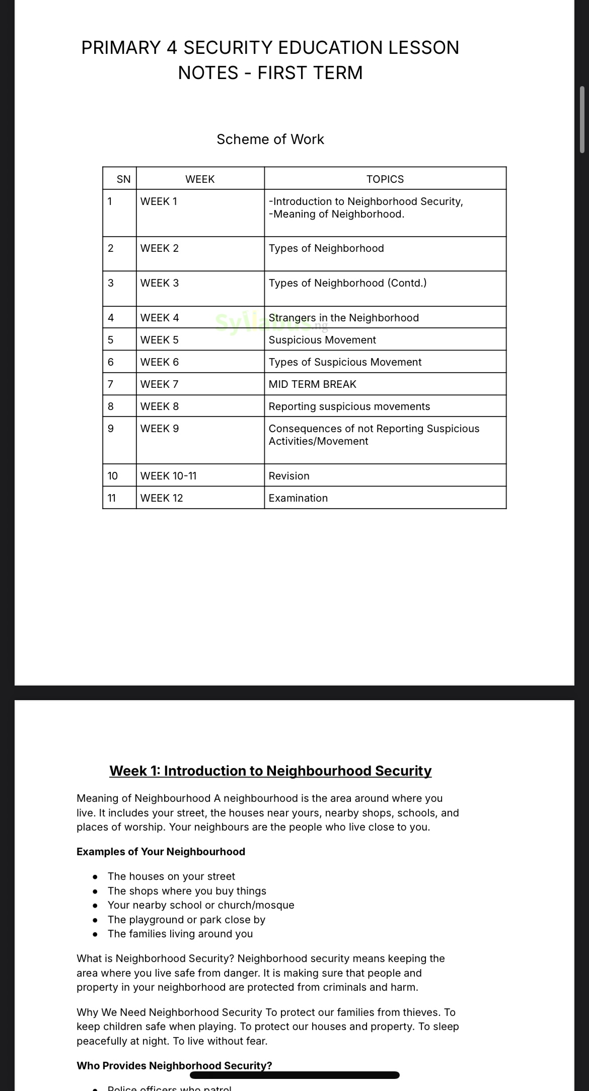 What's Included: Complete lesson notes for all three terms covering essential security topics including neighborhood safety, identifying suspicious activities, emergency response, and personal protection. Each week features detailed content, real-life examples, engaging exercises, and age-appropriate assessments.