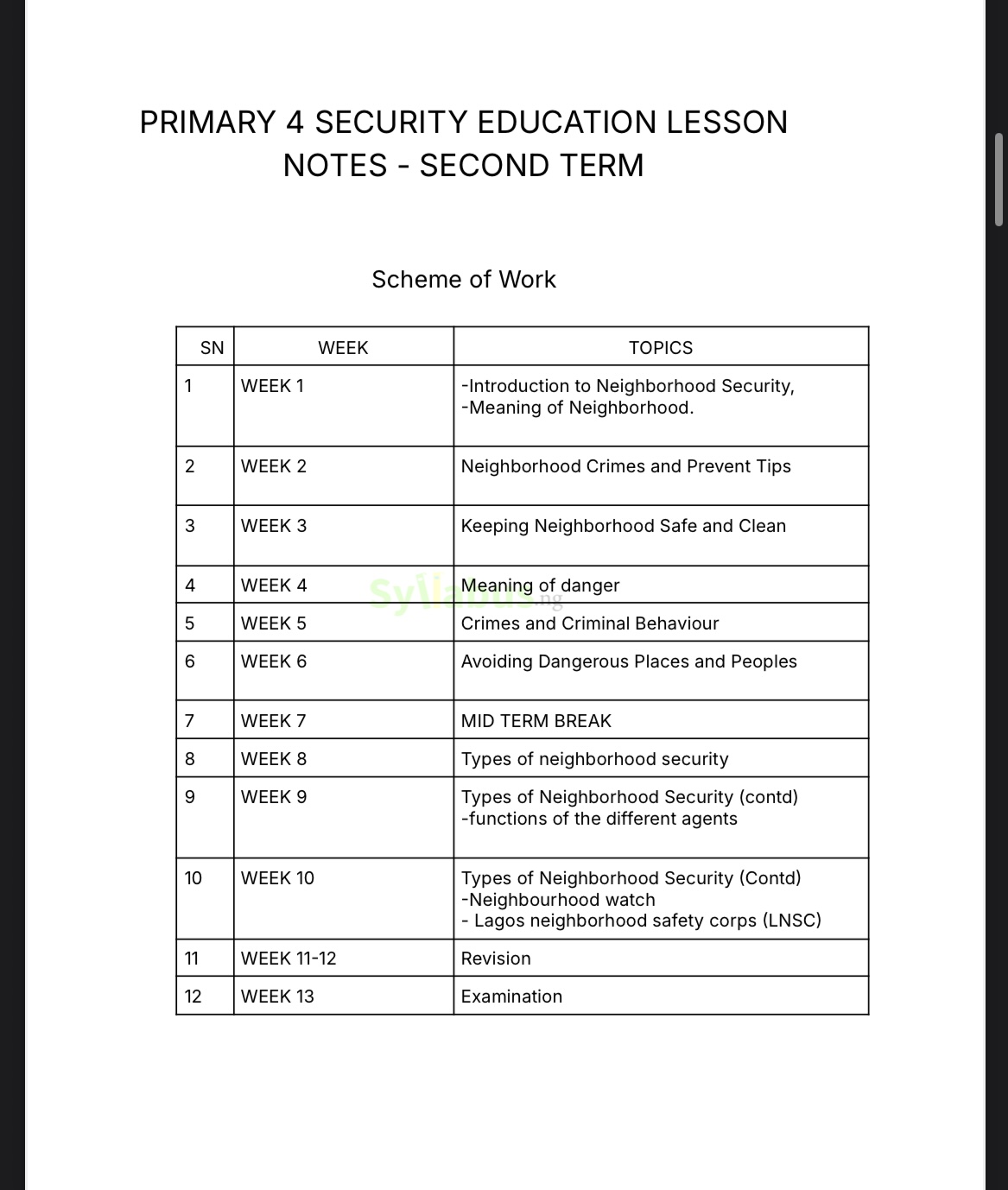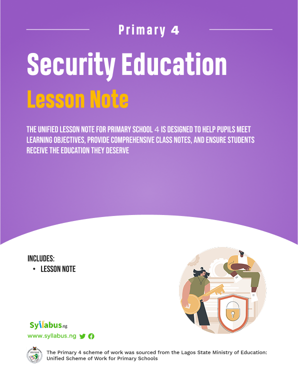 Save countless hours of lesson planning with this comprehensive Security Education Lesson Note designed specifically for Primary 4 educators in Nigeria. Fully aligned with the Lagos State Ministry of Education Unified Scheme of Work and NAPPS curriculum standards.