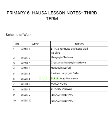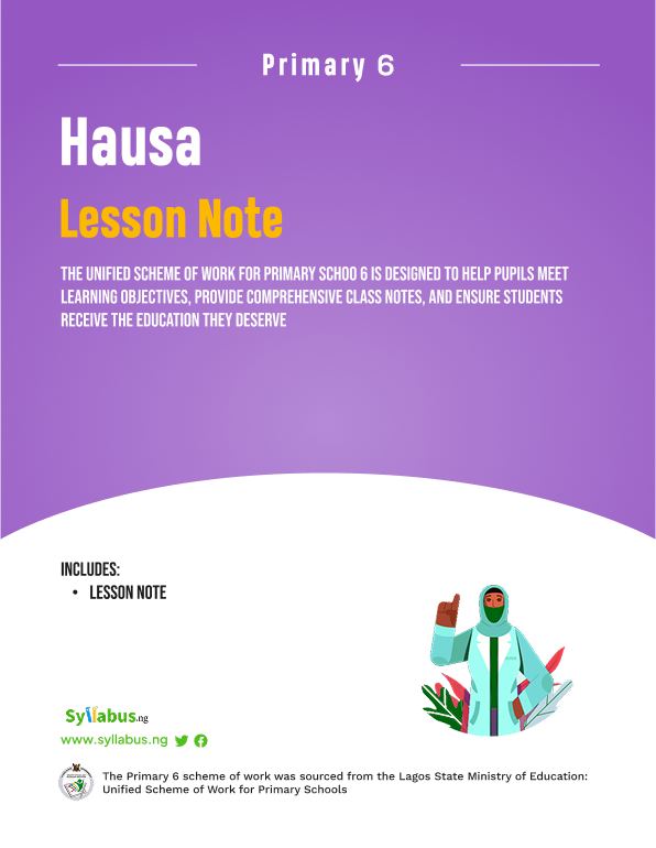 This comprehensive Primary 6 Hausa Lesson Note is expertly designed for Nigerian educators teaching the Hausa language and culture. Fully aligned with the State Unified and NAPPS Scheme of Work, this resource saves countless preparation hours while ensuring authentic language instruction. Each lesson note covers critical areas including Hausa grammar (nahawu), composition writing (rubuce-rubuce), oral literature (al'adun baka, karin magana), reading comprehension (karatu da fahimta), vocabulary building (ƙara kalmomi), and Hausa culture and traditions (al'ada da al'adu). Structured objectives, teaching methods, engaging activities, and assessment tools are provided.