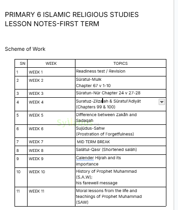 Empower your Islamic education teaching with our comprehensive Primary 6 Islamic Religious Studies Lesson Note, expertly designed for Nigerian educators. This professionally structured resource eliminates countless hours of lesson preparation, allowing you to dedicate more time to nurturing your students' spiritual and moral development. Fully aligned with the Nigerian Educational Research and Development Council (NERDC) curriculum, State Unified Scheme of Work, and NAPPS standards, this lesson note ensures complete compliance with national Islamic education requirements. Each lesson features clear learning objectives, Quranic verses and Hadith references, engaging activities, moral lessons, and assessment strategies.