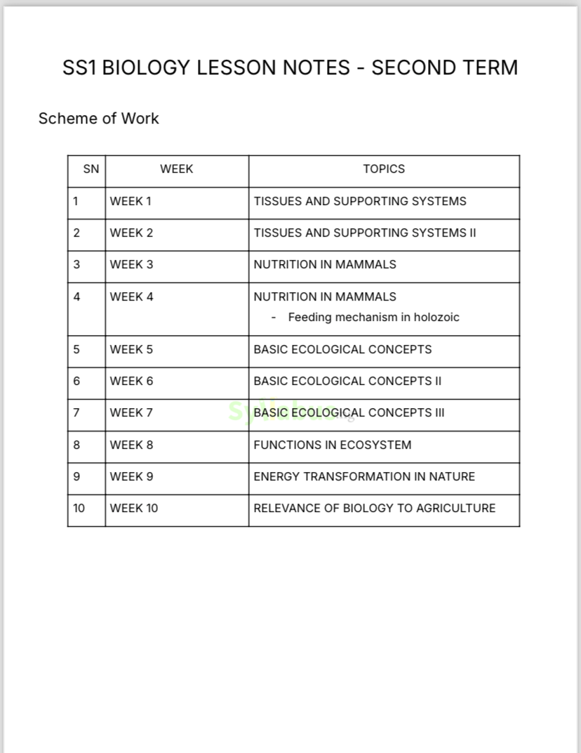 Biology is one of the most fascinating subjects, and these SSS1 lesson notes will help you make it even more exciting for your students. They cover all the topics for the term like cell structure, classification of living things, nutrition, and ecology, all in line with the syllabi. The notes are detailed yet easy to understand, with diagrams, examples, and activities to make learning more interactive. Each lesson comes with clear objectives and evaluation questions, so you can easily track your students’ progress. These notes are perfect for both classroom teaching and private tutoring. They will save you time, keep you organized, and make your lessons more engaging. If you want to help your students understand Biology better and prepare them for exams, these lesson notes are exactly what you need. They will make you feel more confident and prepared for every class. WHY GET OUR LESSON NOTES? Hey there! If you are a teacher, you know how challenging it can be to stay organized and prepared for every lesson. That is why we know you’ll love our SSS1 Lesson Notes. They are designed to make your teaching life so much easier. These notes cover all the topics in the current WAEC and NECO syllabi, so you don’t have to worry about missing anything important. Each one is well-structured, with clear lesson objectives, detailed explanations, examples, and evaluation questions to test your students' understanding. They are perfect for both new and experienced teachers. If you are new, they’ll help you get started. And if you are an experienced teacher, they will save you tons of time and help you focus more on your students. Whether you teach in a school or as a private tutor, these notes will keep you prepared, organized, and stress-free. Once you get started, you will wonder how you ever managed without them!