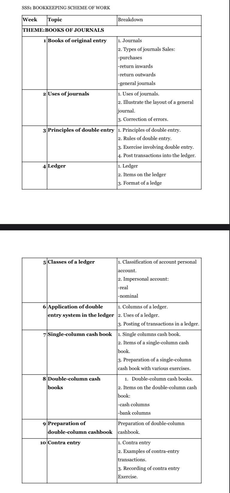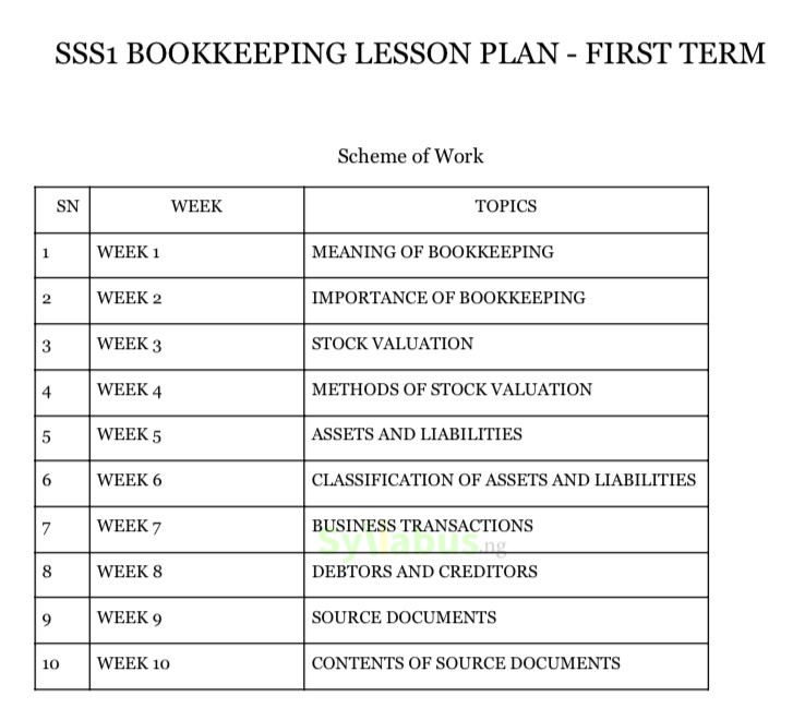 Our Bookkeeping lesson plan will transform your accounting classroom. Designed specifically for teachers, this resource eliminates the stress of lesson planning with detailed, well-structured guides covering essential topics from basic bookkeeping principles to financial records preparation. Each lesson plan includes clear learning objectives, key accounting terminology, teaching strategies, and assessment guidelines. The content is organized week-by-week, following the standard curriculum progression from introduction to bookkeeping through various accounting documents to final accounts preparation. Every lesson features practical examples, ledger exercises, and comprehensive evaluation tools. WHY GET OUR LESSON PLAN? Our lesson plan incorporates effective teaching methodologies with real-world business scenarios, ledger practice exercises, and problem-solving activities that develop bookkeeping skills. It also includes assessment sections, which feature calculation problems, journal entries, financial records preparation, and ready-to-use tests in multiple formats. Perfect for both new and experienced teachers, these lesson plans save you valuable preparation time while ensuring your students master bookkeeping concepts. All content aligns with current curriculum standards, making it an essential resource for any SS1 Bookkeeping teacher.