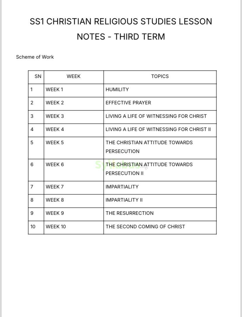Teaching CRS is an opportunity to guide students in both academics and moral growth. These SSS1 CRS lesson notes cover biblical themes, characters, and lessons that align with the scheme for the term. What makes these notes special is how they simplify complex biblical concepts. Each lesson includes clear explanations, relatable examples, and activities to engage your students. You will also find lesson objectives and evaluation questions to ensure your students are learning. If you want to inspire your students spiritually and academically while making your teaching easier, these CRS lesson notes are a fantastic resource. They will help you create meaningful lessons that leave a lasting impact. WHY GET OUR LESSON NOTES? Hey there! If you are a teacher, you know how challenging it can be to stay organized and prepared for every lesson. That is why we know you’ll love our SSS1 Lesson Notes. They are designed to make your teaching life so much easier. These notes cover all the topics in the current WAEC and NECO syllabi, so you don’t have to worry about missing anything important. Each one is well-structured, with clear lesson objectives, detailed explanations, examples, and evaluation questions to test your students' understanding.They are perfect for both new and experienced teachers. If you are new, they’ll help you get started. And if you are an experienced teacher, they will save you tons of time and help you focus more on your students. Whether you teach in a school or as a private tutor, these notes will keep you prepared, organized, and stress-free. Once you get started, you will wonder how you ever managed without them!