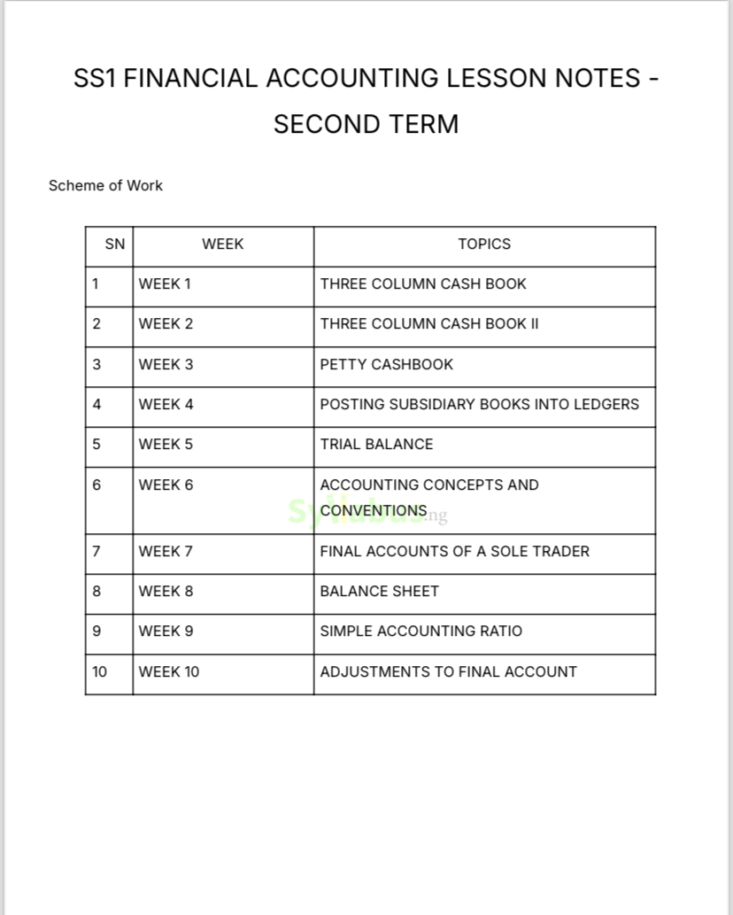 Accounting doesn’t have to be complicated, and our SSS1 lesson notes prove it. They are designed to help you teach topics like double-entry bookkeeping, trial balance, and financial statements in a way that is simple and easy to understand. The notes break down each topic step by step, with examples and exercises to make sure your students get it. Lesson objectives and evaluation questions are also included, so you can keep your teaching organised and track your students’ progress. Whether you are a classroom teacher or a private tutor, these notes will make your job easier. They will give you the confidence to explain tough concepts and help your students succeed.If you want your students to excel in Financial Accounting, these lesson notes are just what you need. WHY GET OUR LESSON NOTES? Hey there! If you are a teacher, you know how challenging it can be to stay organised and prepared for every lesson. That is why we know you’ll love our SSS1 Lesson Notes. They are designed to make your teaching life so much easier.These notes cover all the topics in the current WAEC and NECO syllabi, so you don’t have to worry about missing anything important. Each one is well-structured, with clear lesson objectives, detailed explanations, examples, and evaluation questions to test your students' understanding.They are perfect for both new and experienced teachers. If you are new, they’ll help you get started. And if you are an experienced teacher, they will save you tons of time and help you focus more on your students. Whether you teach in a school or as a private tutor, these notes will keep you prepared, organized, and stress-free.Once you get started, you will wonder how you ever managed without them!
