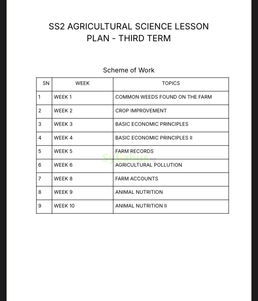 SS2 AGRICULTURAL SCIENCE LESSON PLAN DESCRIPTIONS Our SSS2 Agricultural Science Lesson Plans are a lifesaver for busy teachers! They cover everything from crop production to animal husbandry, with ready-to-use practical activities that'll keep your students engaged all term long. Gone are the late nights planning tomorrow's lesson. Each week is thoughtfully structured with clear objectives, farm-based examples, and assessment ideas that actually work in real classrooms. We've packed in everything from teaching soil fertility techniques to guiding students through livestock management, all organized in an easy-to-follow format that flows naturally from one lesson to the next. It is perfect for both new teachers finding their feet and veterans looking to refresh their approach. These plans breathe new life into standard curriculum topics and give you back hours of your precious time. Grab yours today, your future self will thank you! WHY GET OUR LESSON PLANS? Let's be honest, teaching Agricultural Science well takes serious prep time. Between farm demonstrations, grading practical notebooks, and trying to have a life outside school, who has hours to craft detailed lesson plans? That's exactly why we created these comprehensive SSS2 Agricultural Science Lesson Plans. They're designed by teachers who understand the real challenges you face every day. From teaching modern cultivation methods to guiding students through agricultural extension services, we've thought through each lesson so you don't have to. Every week includes straightforward objectives, content explanations in simple terms, practical teaching strategies, and ready-to-use assessment questions. Best of all? They're fully aligned with the curriculum, so you know you're covering everything your students need to succeed.