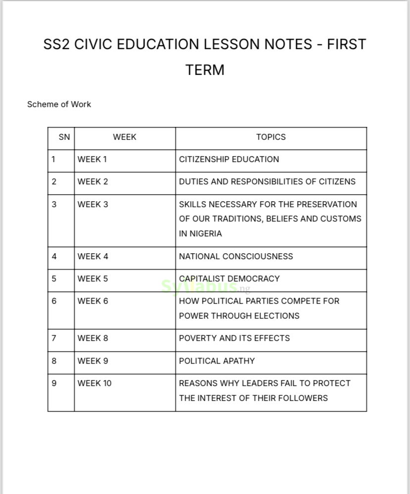 What civic topics are covered in the SS2 exam questions? The questions cover all core SS2 Civic Education topics, including citizenship education, democracy, political participation, civic rights and responsibilities, national consciousness, poverty alleviation, political apathy, leadership accountability, and national values.