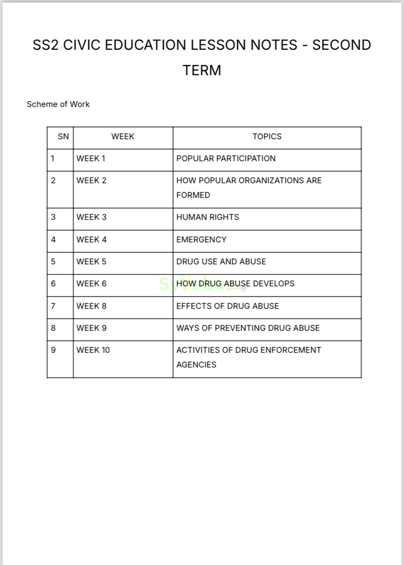 SS2 CIVIC EDUCATION EXAM QUESTIONS DESCRIPTIONS Enhance your assessment strategy with our comprehensive SS2 Civic Education Exam Questions! Thoughtfully crafted for educators, these questions take the stress out of exam preparation by providing a diverse collection of assessment materials that align perfectly with the current curriculum. From citizenship education and democratic principles to national consciousness, political participation, and societal challenges, our exam questions cover all essential civic concepts your SS2 students need to master. Each section features carefully structured questions that progress in difficulty, allowing you to accurately gauge your students' understanding of civic responsibilities and values. Complete with detailed marking schemes and model answers, these questions simplify your evaluation process while challenging students to think critically about their roles as citizens. Whether you're a seasoned Civic Education teacher or new to SS2, these exam questions serve as the perfect tool to assess your students' civic knowledge and prepare them to become responsible citizens. Secure your copy today and transform your assessment approach! WHY GET OUR EXAM QUESTIONS? Creating meaningful Civic Education assessments that thoroughly evaluate students' understanding of citizenship, democracy, and civic responsibilities while adhering to curriculum standards can be incredibly time-consuming. That's where our comprehensive exam question package makes all the difference! Covering all three terms of SS2 Civic Education, these professionally designed questions assess students' knowledge of citizenship education, democratic principles, political participation, national consciousness, and socio-economic issues through a balanced mix of objective and theory questions. Each set progresses logically from basic recall to complex analysis, providing a complete evaluation of your students' civic awareness. With our ready-to-use exam questions, you'll save countless hours on question formulation and focus instead on developing engaged, responsible citizens. Each package includes detailed marking guides and model answers, making grading straightforward and consistent while ensuring students receive valuable feedback. Whether you're an experienced educator or new to teaching Civic Education at the SS2 level, these exam questions provide reliable assessment tools to accurately measure student performance and prepare them for active citizenship. Available in digital format for immediate use on any device, these resources will revolutionize your assessment approach while maintaining the highest educational standards.