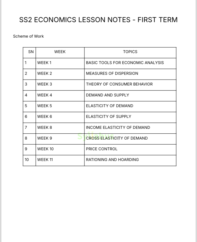 Economics is such a vital subject, and our SSS2 Economics lesson note ensures you can teach it with ease and confidence. This note covers topics like demand and supply, market structures, national income, and international trade in a way that is easy to understand and teach. It is packed with real-life examples and case studies that help students connect theory to what is happening in the world around them. The lesson note is written in a way that helps you explain economic principles, keeping your students engaged and curious. You will also get engaging activities and review questions to test your students’ understanding and prepare them for exams. It is designed to save you time on planning while ensuring you deliver excellent lessons that leave a lasting impact.If you want to make your Economics classes more exciting and impactful, this lesson note is the perfect tool. It is like having an extra helping hand in your teaching journey! WHY GET OUR LESSON NOTES? Imagine having a complete guide that makes lesson planning easy, saves time, and ensures you deliver top-notch lessons every time. That is what our SSS2 lesson notes offer! Our lesson notes are created by experienced educators who know the curriculum inside out. They cover all the topics you need to teach for the term, breaking them down into simple, easy-to-follow steps. Each note comes with detailed explanations, relevant examples, and activities to engage your students. We designed these notes to make your job easier, so you can focus on what matters—teaching and inspiring your students. Whether you are a new teacher or a seasoned pro, our lesson notes will help you stay organized, confident, and effective in the classroom.With these lesson notes, you don’t just teach—you impact lives.