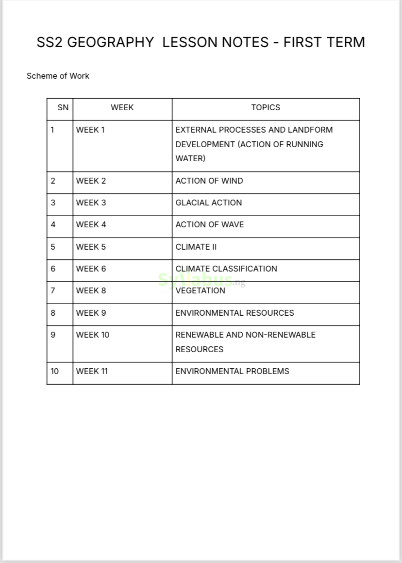 Geography is all about exploring the world, and our SSS2 Geography lesson note helps you bring the subject to life for your students. It covers topics like map reading, climate, population studies, and physical geography in a way that is engaging and easy to follow. The note is designed to guide you through each lesson with clear objectives, detailed explanations, and illustrations that make complex ideas simpler. Whether it is teaching the solar system or discussing environmental challenges, you will have all the tools you need to make your classes interesting and impactful. We have also included activities and real-world examples to keep your students engaged while helping them understand the practical side of Geography. With this lesson note, you can teach the syllabus, save time on lesson planning, and inspire your students to see the beauty of the world around them.Trust me, this note will make Geography one of your favourite subjects to teach! WHY GET OUR LESSON NOTES? Imagine having a complete guide that makes lesson planning easy, saves time, and ensures you deliver top-notch lessons every time. That is what our SSS2 lesson notes offer! Our lesson notes are created by experienced educators who know the curriculum inside out. They cover all the topics you need to teach for the term, breaking them down into simple, easy-to-follow steps. Each note comes with detailed explanations, relevant examples, and activities to engage your students. We designed these notes to make your job easier, so you can focus on what matters—teaching and inspiring your students. Whether you are a new teacher or a seasoned pro, our lesson notes will help you stay organized, confident, and effective in the classroom.With these lesson notes, you don’t just teach—you impact lives.