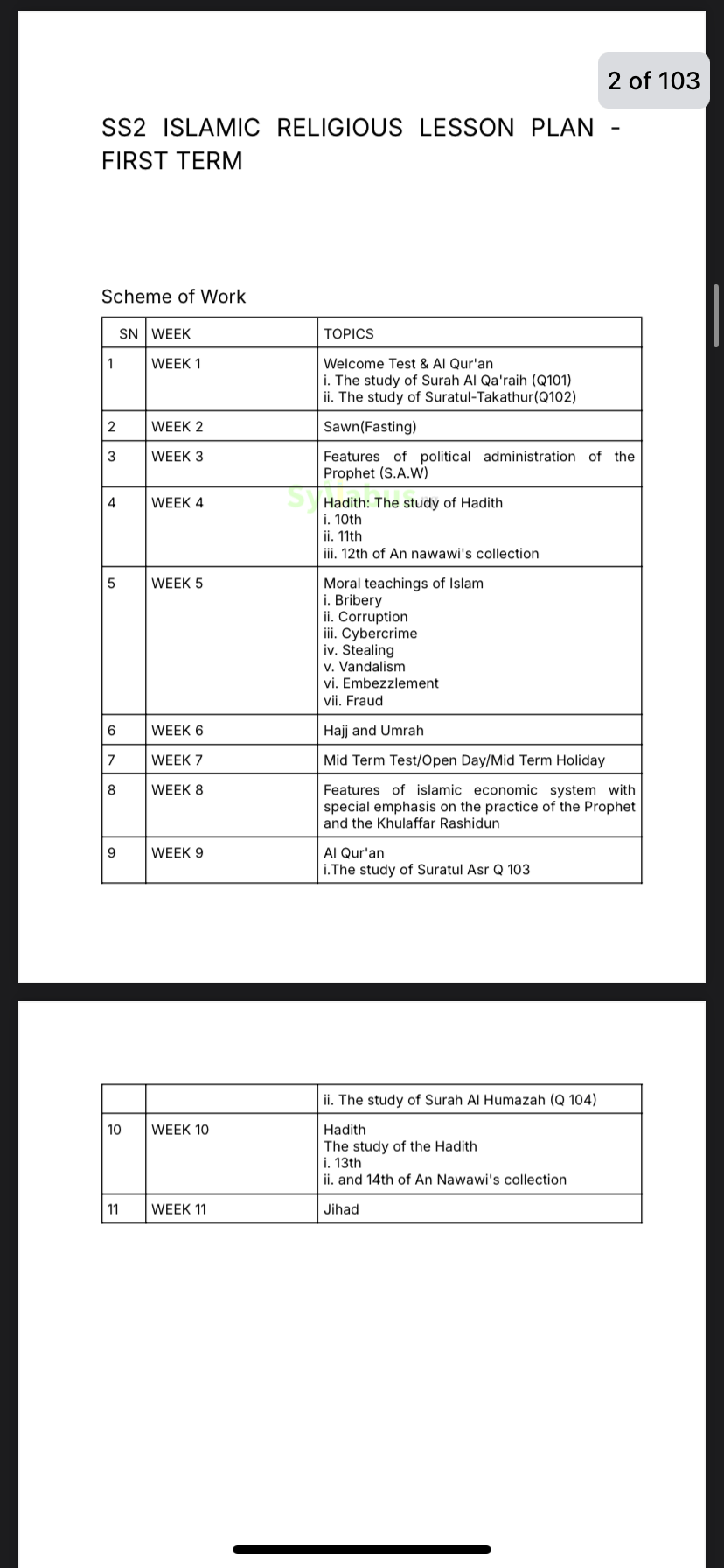 SS2 ISLAMIC RELIGIOUS STUDIES LESSON PLAN DESCRIPTIONS Our lesson plans are carefully designed for teachers, they help take the stress out of lesson planning by offering well-organized and detailed guides. From Qur'anic studies to Islamic jurisprudence, the lesson plan provides clear explanations and practical teaching strategies that simplify your teaching. They also include interactive activities, assessment methods, and assignment options to reinforce learning in the classroom. Whether you're a new or experienced teacher, these lesson plans are here to help you save time and ensure your students stay engaged. It's like having a teaching assistant that does half the work for you! Grab your copy now! WHY GET OUR LESSON PLANS? Teaching can be challenging, especially when you're trying to create lesson notes that engage students while covering the syllabus. That is where our ebook series comes in! These ebooks are designed to make lesson planning easier for teachers. Covering all topics in the curriculum, each lesson plan is packed with well-structured lesson notes, key learning objectives, examples, and activities that align with the current curriculum. With these resources, you can save time on lesson preparation and focus on delivering your lessons. Whether you are new to teaching or an experienced educator, our lesson plans are your go-to guide for creating a unique and interactive classroom experience. Plus, they are downloadable and easy to use on any device.
