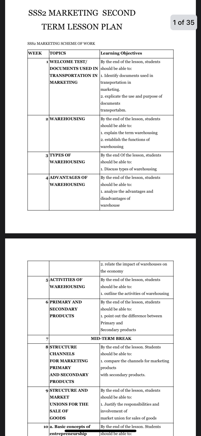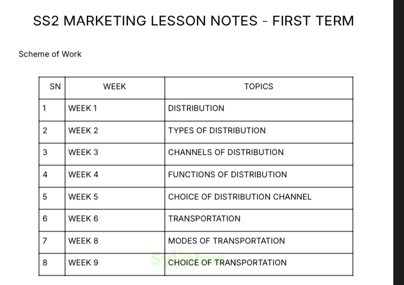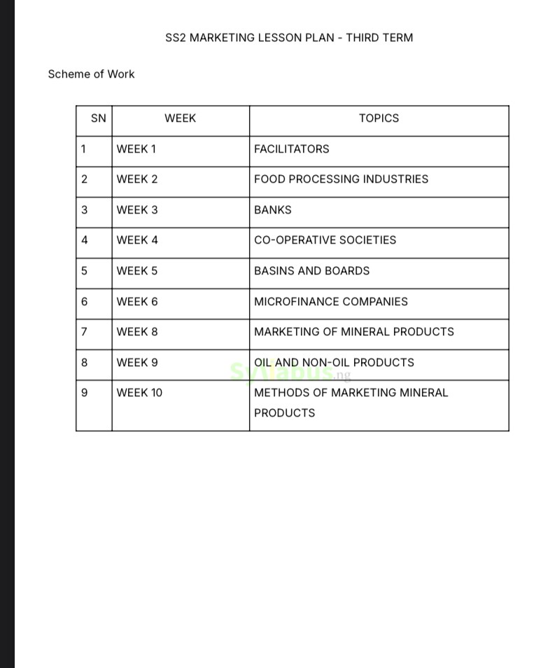 SS2 MARKETING LESSON PLAN DESCRIPTIONS Our SS2 Marketing lesson plans are carefully designed for teachers, they help take the stress out of lesson planning by offering well-organized and detailed guides. From marketing fundamentals to contemporary digital strategies, the lesson plan provides clear explanations and practical teaching strategies that simplify your teaching. They also include interactive activities, assessment methods, and assignment options to reinforce learning in the classroom. Whether you're a new or experienced teacher, these lesson plans are here to help you save time and ensure your students stay engaged. It's like having a teaching assistant that does half the work for you! Grab your copy now! WHY GET OUR LESSON PLANS? Teaching can be challenging, especially when you're trying to create lesson notes that engage students while covering the syllabus. That is where our ebook series comes in! These ebooks are designed to make lesson planning easier for teachers. Covering all topics in the curriculum, each lesson plan is packed with well-structured lesson notes, key learning objectives, examples, and activities that align with the current curriculum. With these resources, you can save time on lesson preparation and focus on delivering your lessons. Whether you are new to teaching or an experienced educator, our lesson plans are your go-to guide for creating a unique and interactive classroom experience. Plus, they are downloadable and easy to use on any device.