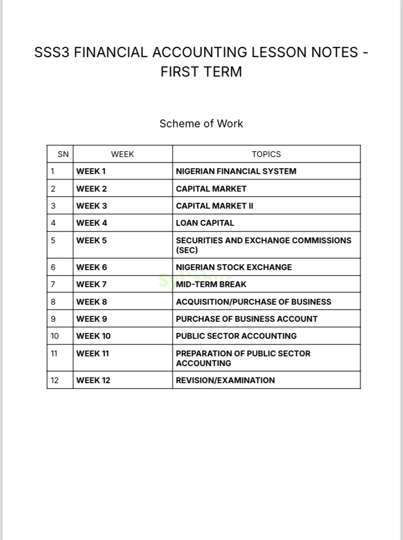 SS3 FINANCIAL ACCOUNTING EXAM QUESTIONS DESCRIPTION Preparing your students for Financial Accounting examinations just became effortless with our comprehensive SS3 Financial Accounting Exam Questions pack! Expertly designed for teachers, these questions help eliminate the stress of exam preparation by providing well-structured and curriculum-aligned assessment materials. From financial systems and capital markets to debentures, government revenue, and stock exchange operations, this resource thoroughly tests students' understanding of advanced accounting principles. The questions expertly evaluate students' knowledge of primary and secondary markets, public sector accounting, and critical financial instruments that form the backbone of modern business practices. The pack includes both objective and theory questions with detailed answers for the multiple-choice section. Whether you're a new or experienced Accounting teacher, these exam questions will save you valuable preparation time while ensuring your students are thoroughly tested on essential financial concepts. It's like having a chartered accountant that does half the work for you! Grab your copy now! WHY GET OUR EXAM QUESTIONS? Creating comprehensive Financial Accounting exam questions that effectively assess students' understanding while covering complex financial principles can be time-consuming and challenging. That's where our SS3 Financial Accounting Exam Questions pack becomes your essential teaching companion! This carefully curated resource features: