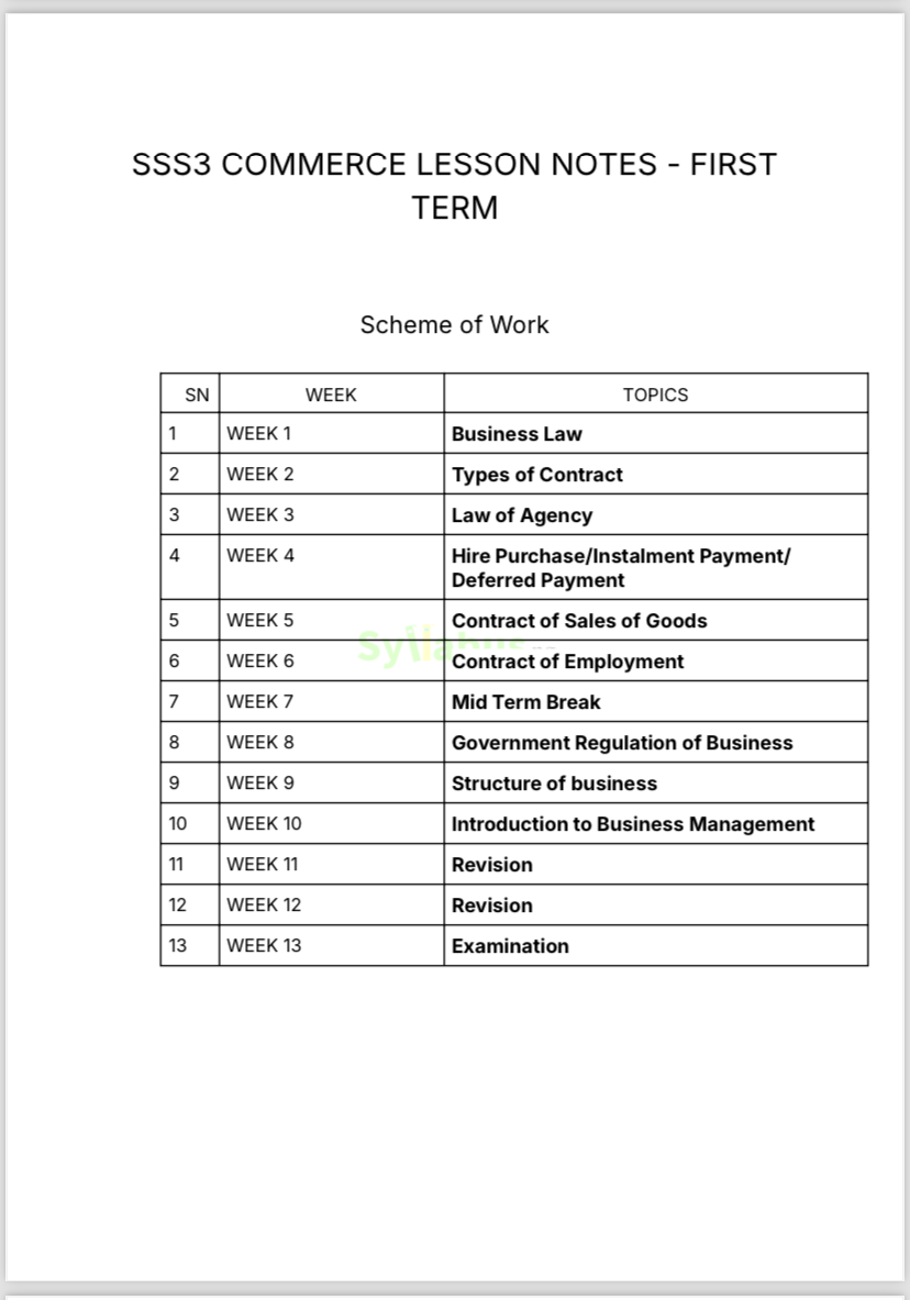 Commerce is one subject that connects students to the real world if taught right. Our SSS3 Commerce lesson note helps you deliver lessons that are both practical and impactful. It covers all the topics in the scheme in a way that is easy to understand and teach. Our lesson notes break down difficult topics with simple explanations and relatable examples. It also includes activities and real-world scenarios to keep your students engaged and help them see how Commerce applies to everyday life. It is the perfect resource for saving you time and ensuring your students excel in their exams and future endeavours. Our notes ensure that your lessons are clear, concise, and effective.Trust me, this lesson note will make teaching Commerce feel like second nature! WHY GET OUR LESSON NOTES? Every teacher deserves a complete guide that makes lesson planning easy, saves time, and ensures you deliver top-notch lessons every time. We know this and that is what our SSS3 Commerce lesson notes offer! These lesson notes have been written carefully with your comfort in mind. They cover all the topics you need to teach for the term and it comes with detailed explanations, relevant examples, and activities to engage your students. The notes have been written to make your job easier, so you can focus on teaching and inspiring your students. Believe us when we say our lesson notes will help you stay organized, confident, and effective in the classroom.So make sure you get a copy of this today!