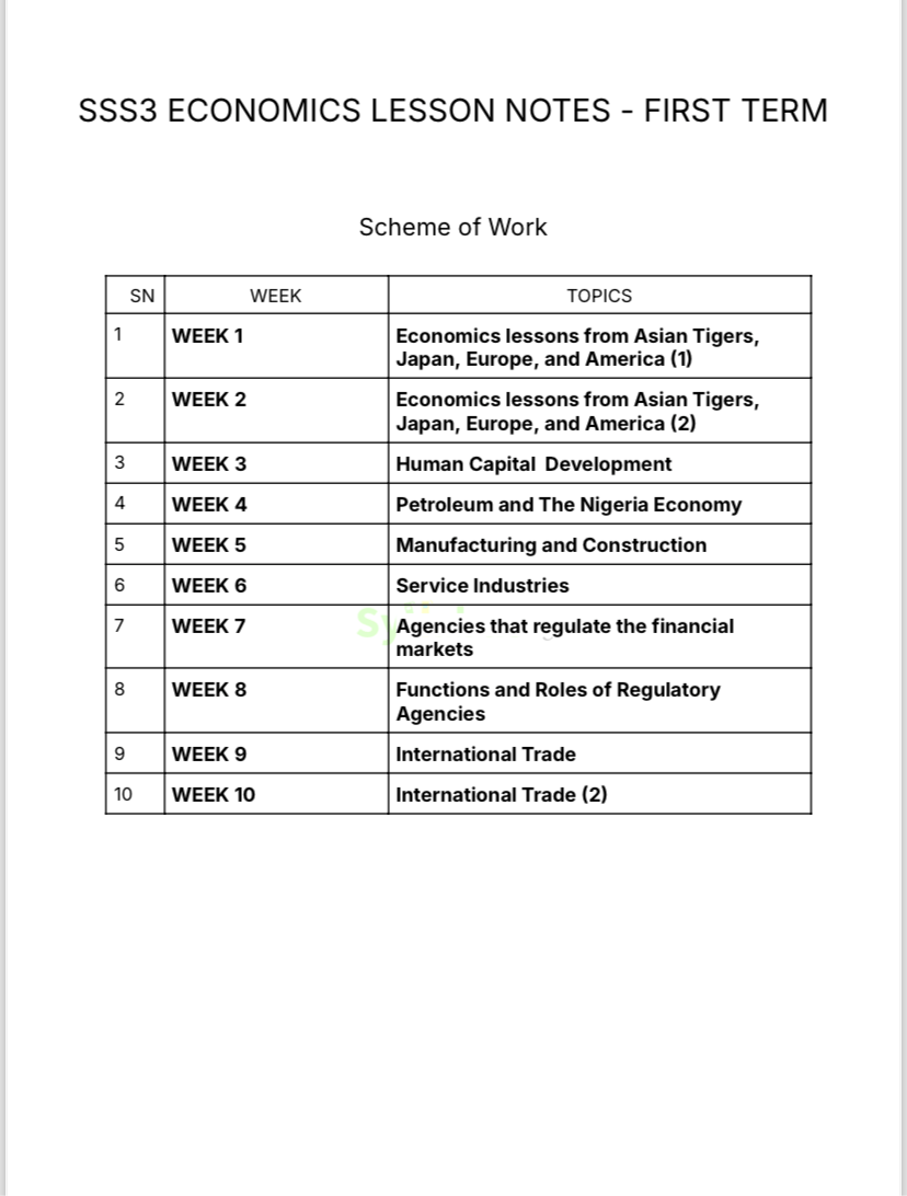 Economics is all about understanding how resources are used and distributed, and this SSS3 lesson note breaks it down perfectly for you and your students. It covers all key topics like demand and supply, inflation, government policies, international trade, etc. The note is written in a clear and engaging style, with real-world examples to help students relate to what they’re learning. It is also exam-focused, with past questions and answers included to prepare your students for WAEC and JAMB. You will love how this lesson note saves you time and keeps your lessons organized. It is perfect for helping students understand complex economic concepts while developing critical thinking skills. If you want to teach Economics better and help your students excel, grab a copy today! WHY GET OUR LESSON NOTES? Dear teachers and all those in the education sector, we know how tough it can be to stay on top of everything as a teacher, especially when it comes to preparing detailed lesson notes. That is why we are excited to tell you about our SSS3 Economics lesson notes—they are a game-changer! These lesson notes are designed to make teaching Economics easier. They are packed with everything you need to deliver effective and engaging lessons, from clear explanations of important concepts to real-life examples and activities that keep your students interested. They cover all subjects and are written to align with the WAEC and NECO syllabus. The best part? They save you so much time! Instead of spending hours planning, you will have ready-made, well-organized notes that you can start using immediately. Plus, they are exam-focused, helping your students prepare for their finals with confidence.You can even tweak the notes to fit your teaching style. So, if you want to reduce stress and give your students top-quality learning, grab a copy today! It’s worth it.