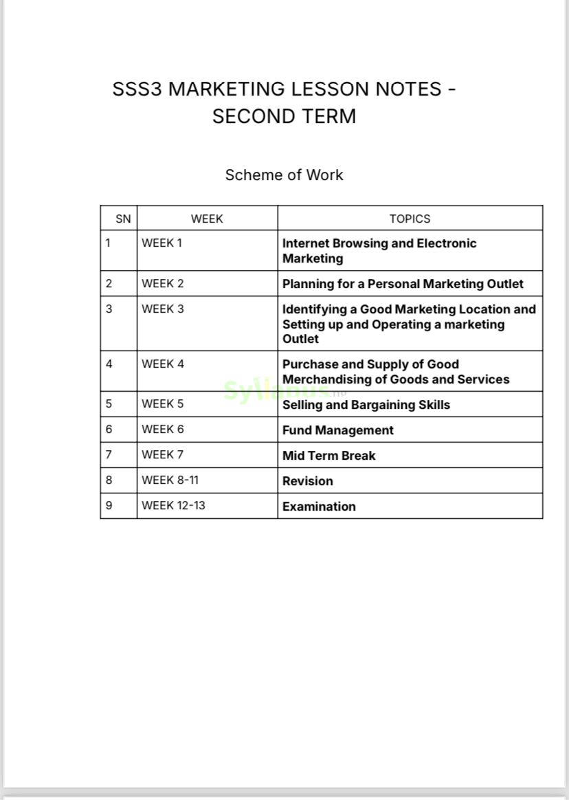 Teaching SSS3 Marketing has never been this easy! This lesson note covers all the key topics, including market segmentation, consumer behaviour, branding, and marketing mix, following the syllabus. The notes are written in a conversational style, with real-world examples that help students relate marketing concepts to everyday life. It is also packed with exercises and exam-focused tips to ensure your students are well-prepared for WAEC and JAMB. Whether you are introducing new concepts or revising for exams, this lesson note is a reliable resource that saves you time and makes your lessons engaging. Help your students understand the exciting world of marketing and prepare for success with this detailed and easy-to-use note. Get yours today! WHY GET OUR LESSON NOTES? Dear teachers, including private tutors, we know how stressful teaching is especially when it comes to preparing detailed lesson notes every term. That is why we are excited to tell you about our SSS3 Marketing lesson notes. These lesson notes are designed to make teaching Marketing easier. They are packed with everything you need to deliver effective and engaging lessons, from clear explanations of important concepts to real-life examples and activities that keep your students interested. The best part? They save you so much time! Instead of spending hours planning, you will have ready-made, well-organized notes that you can start using immediately. Plus, they are exam-focused, helping your students prepare for their finals with confidence.You can even tweak the notes to fit your teaching style. So, if you want to reduce stress and give your students top-quality learning, grab a copy today! It’s worth it.